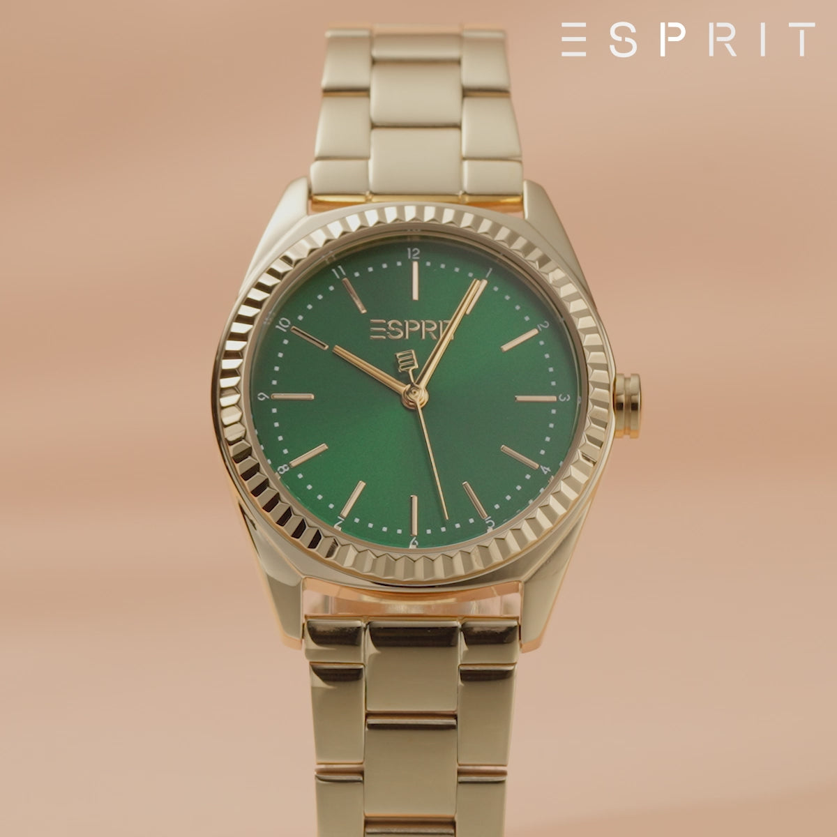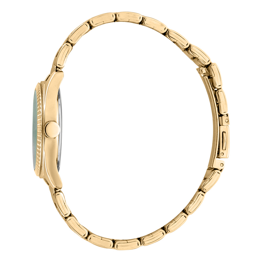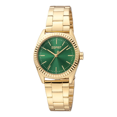 The gold-tone with green dial and a unique bezel design gives this watch its trendy, elegant look.