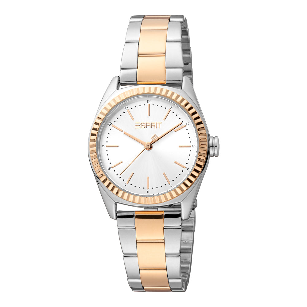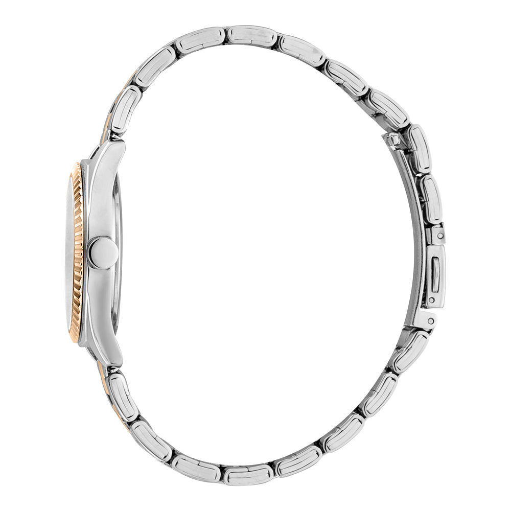 The two-tone design with silver and a unique bezel design gives this watch its trendy, elegant look.