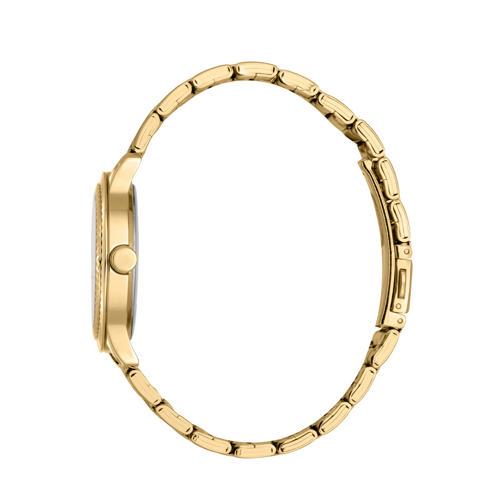 Featuring a warm gold metal strap, a stunning gold watch with a textured bezel and a dial encrusted with stones, this timepiece is ideal for wearing during the day or at night. Paired with a gold bracelet, this surely is a must have.