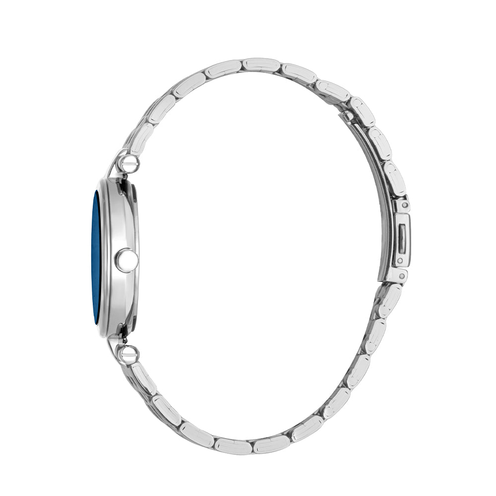 Crafted in polished steel, this 3-hand watch features a minimalist blue dial and stylish T-bar design paired with a silver stainless steel bracelet for a creative twist.