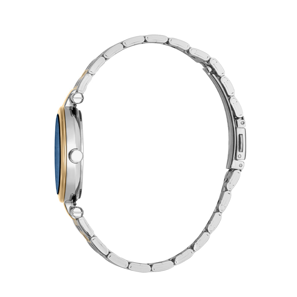 Crafted in polished steel, this 3-hand watch features a minimalist blue dial and stylish T-bar design paired with a two-tone stainless steel bracelet for a creative twist.