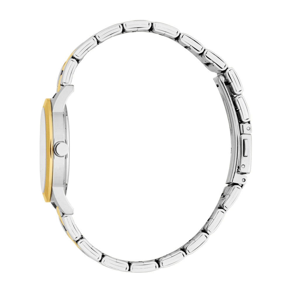 Introducing our striking timepiece: a silver dial encased in a stylish two-tone gold and silver metal strap. This watch is a perfect blend of classic charm and modern sophistication, making it an essential accessory for those who appreciate elegance with a touch of contemporary flair