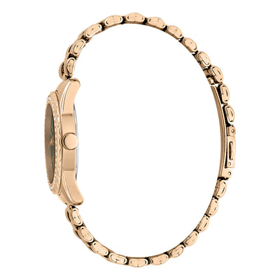 This glamorous watch adds elegance to your simple look. With its embellishments and rose gold plating, it will become your must have watch.