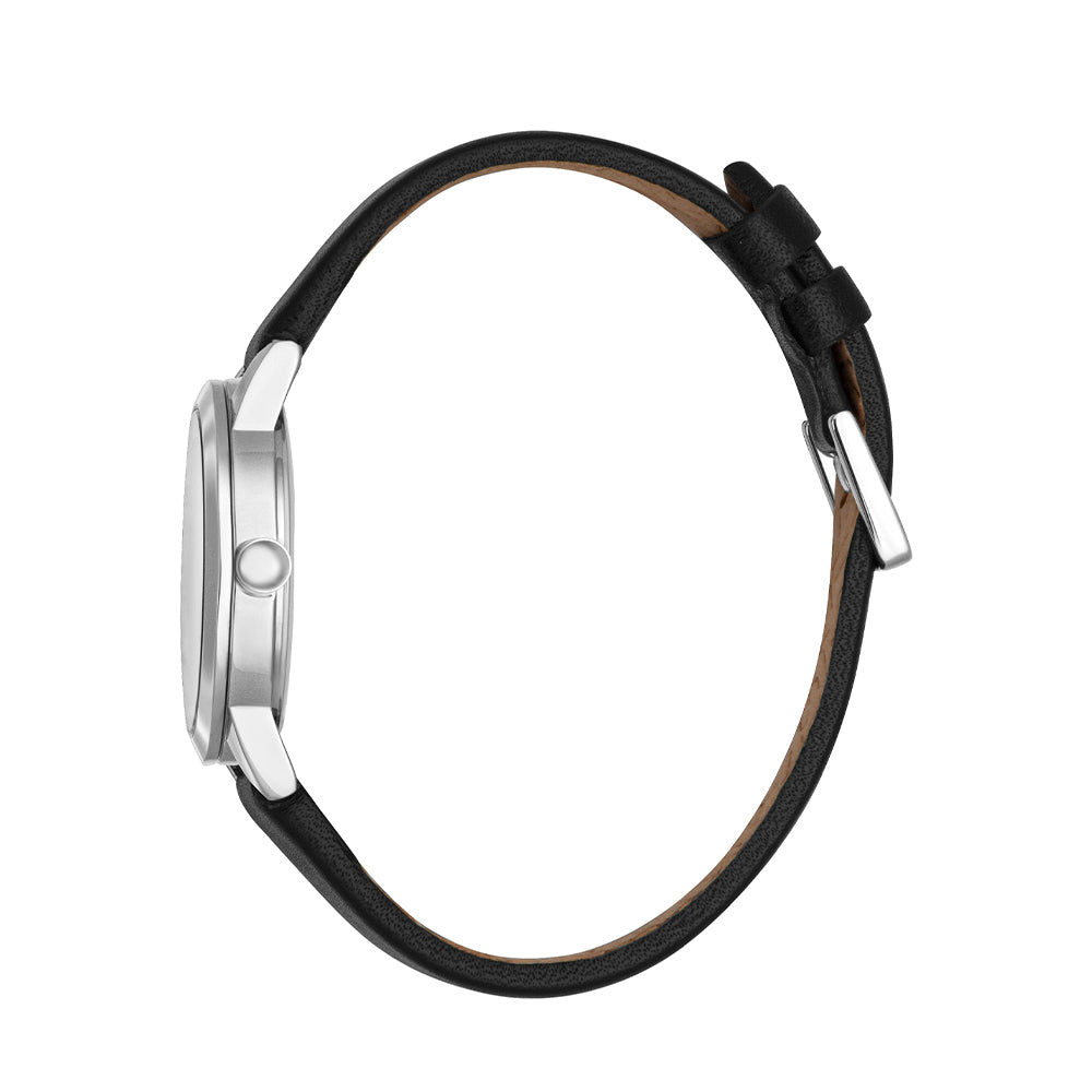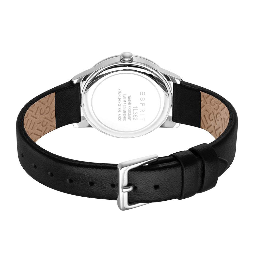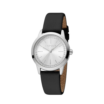 Black leather and silver-tone stainless steel are winning complements for this striking crystal-set timepiece from Esprit.