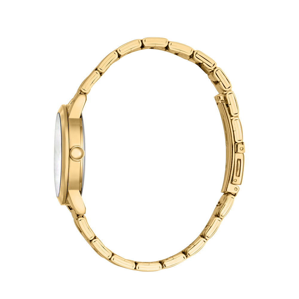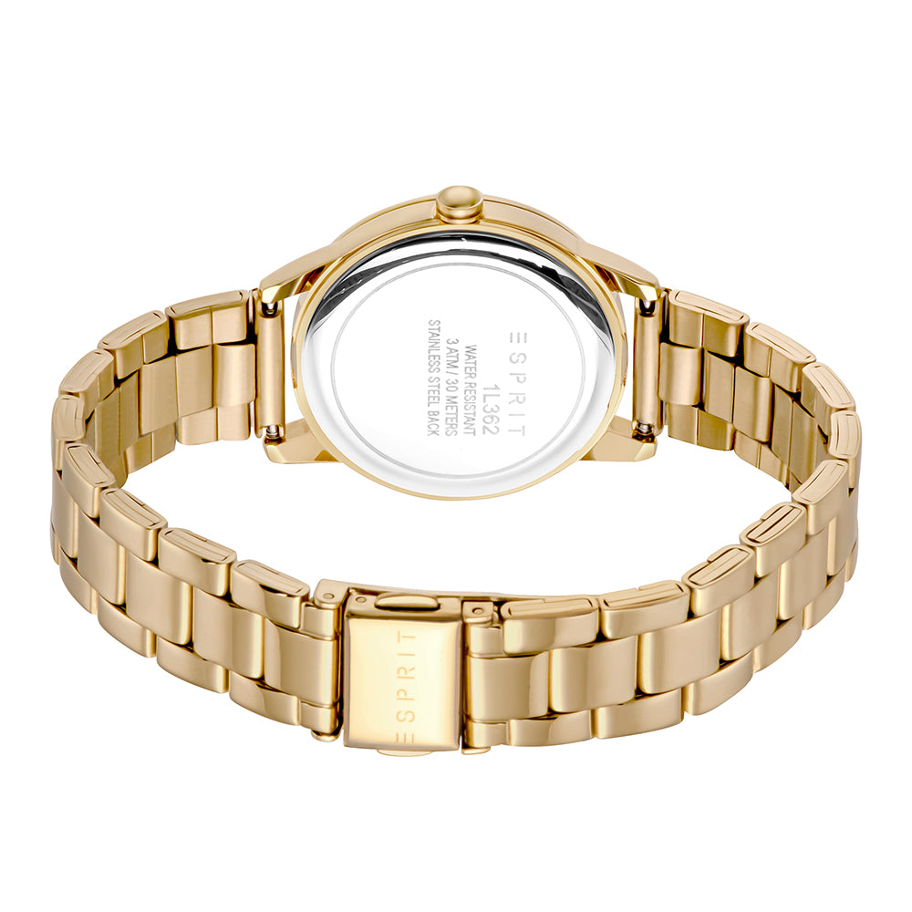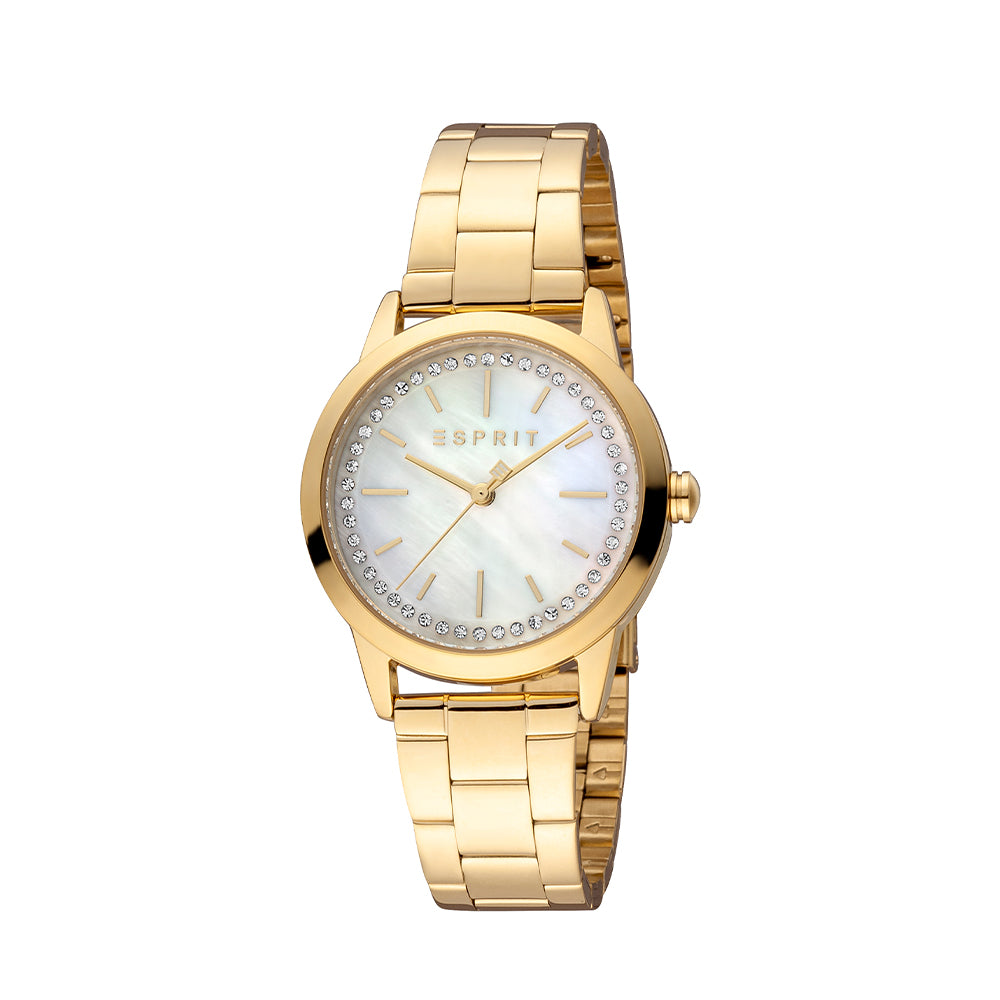 Gold-tone stainless steel bracelet and watch case are winning complements for this striking crystal-set timepiece from Esprit.
