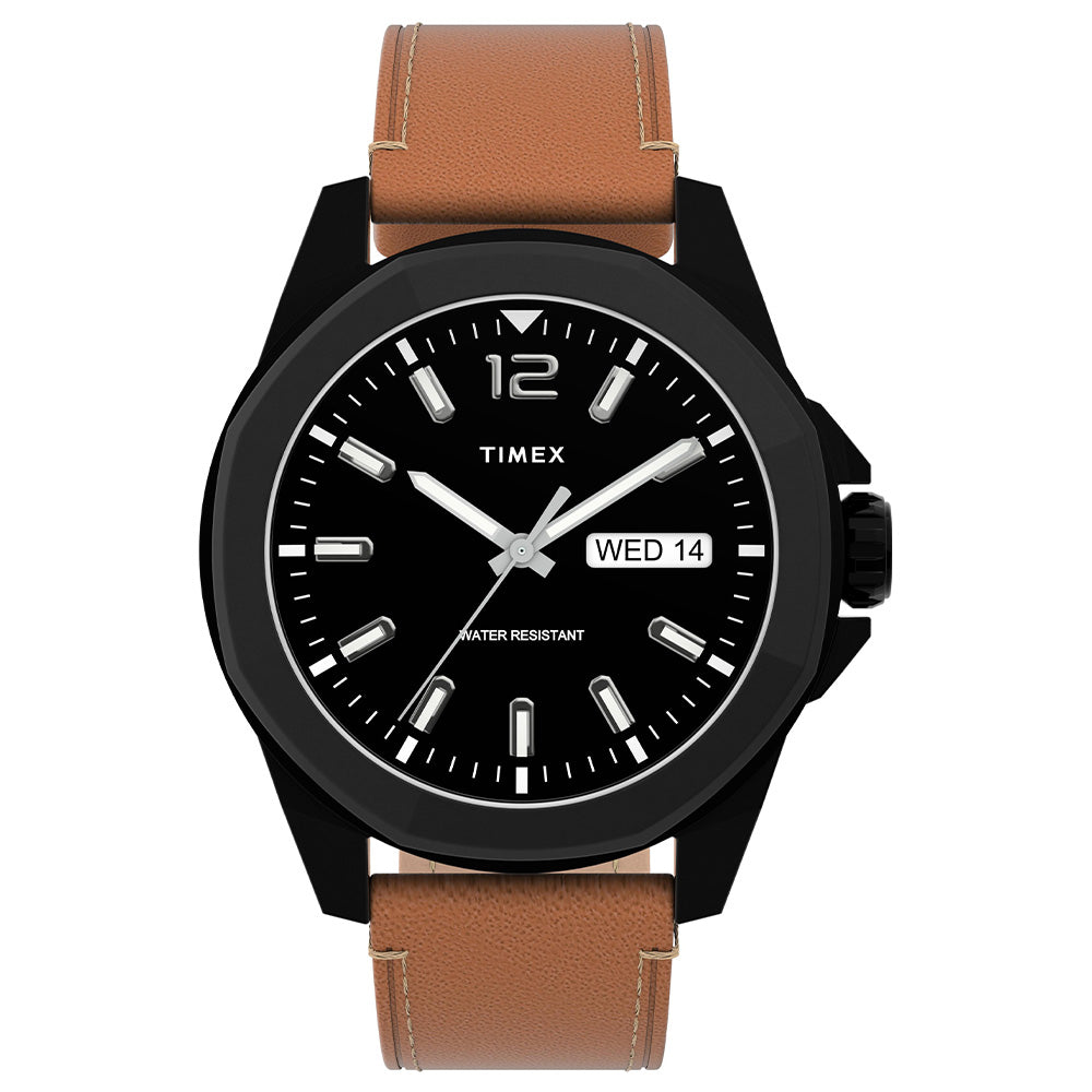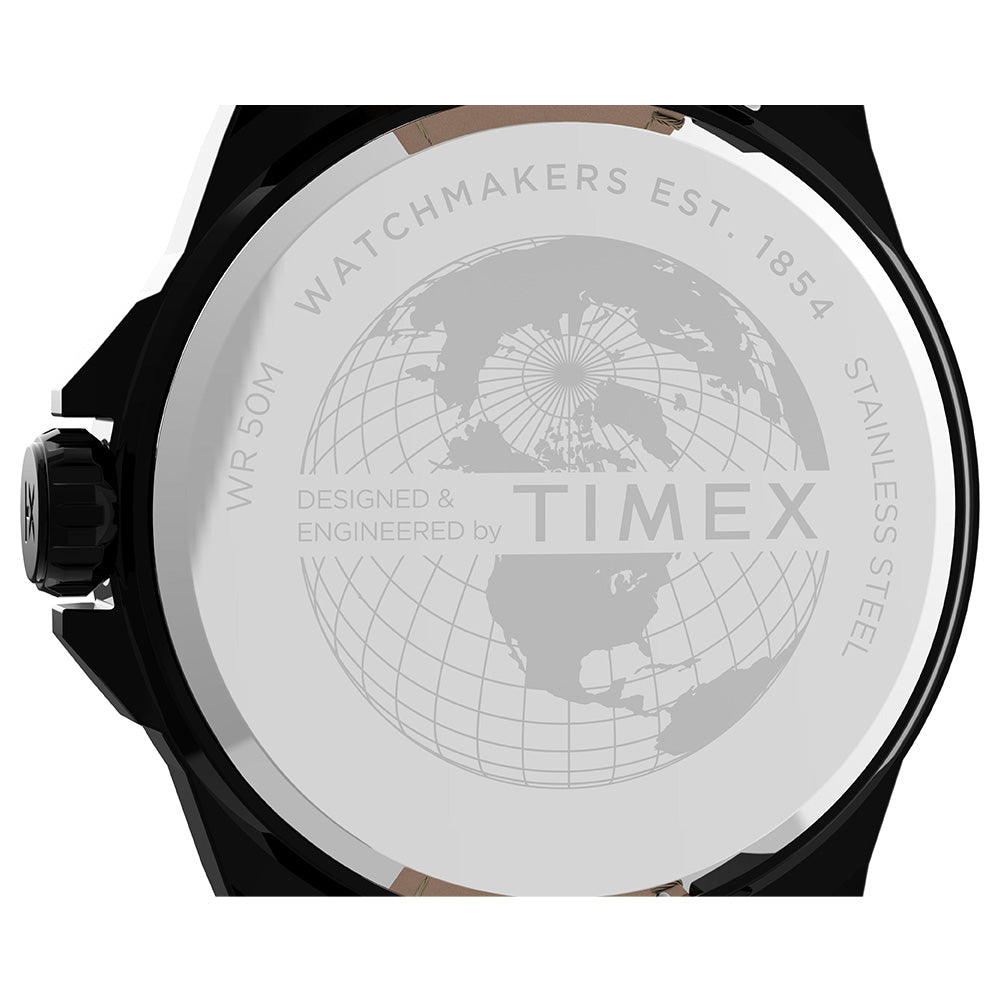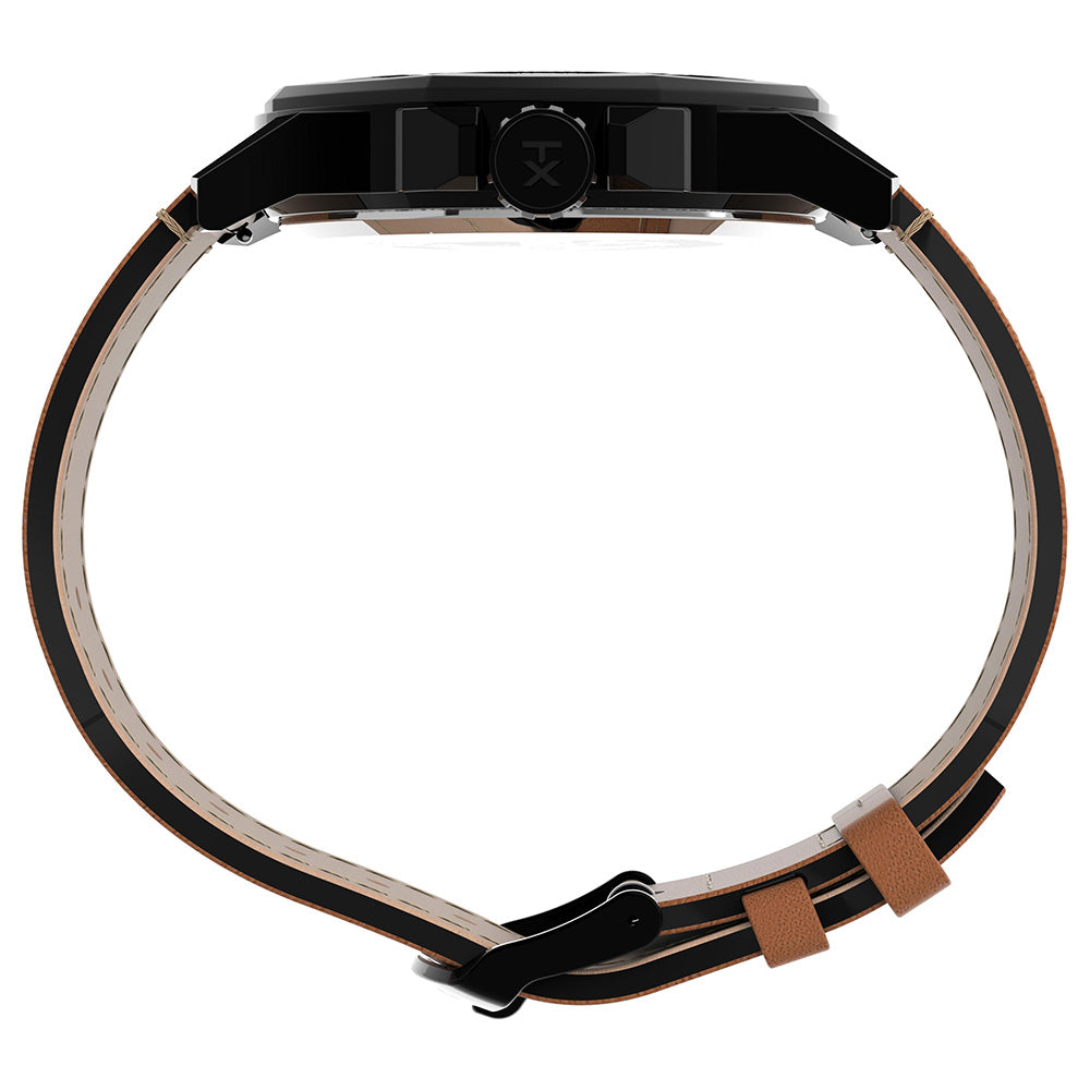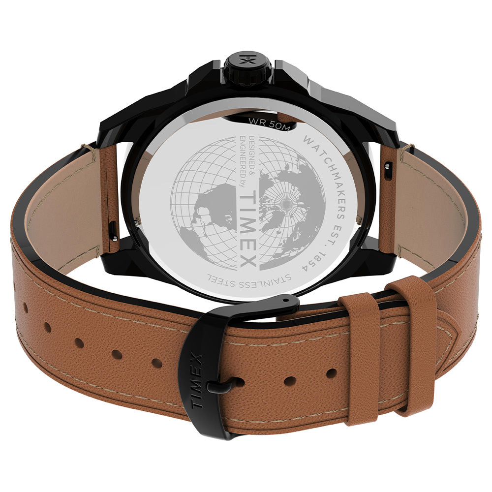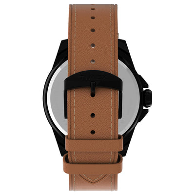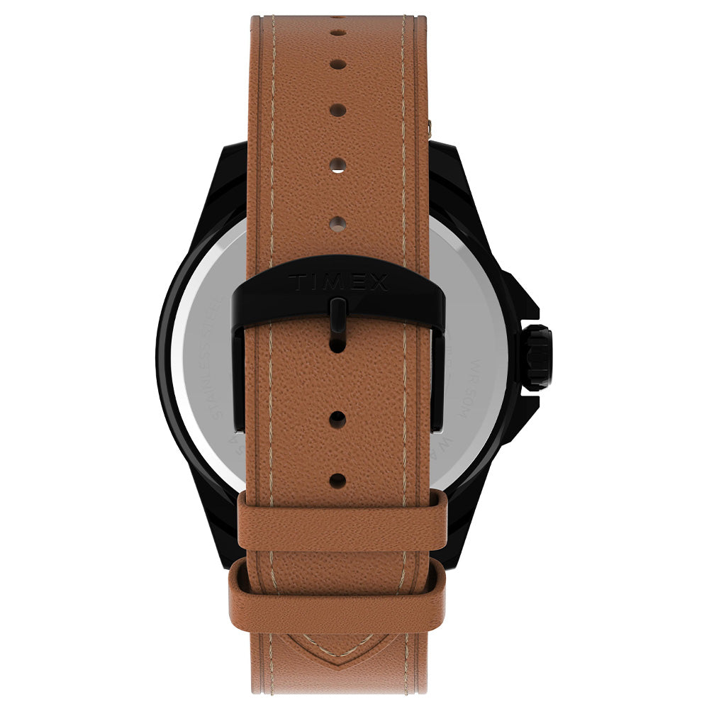 Our legendary durability comes to life with a modern analog watch that looks like it can take a licking and keep on ticking. The black octagonal top ring and crown protector complete an oversized 44mm case that is water-resistant up to 50 meters and is paired with a stitched tan natural leather strap.