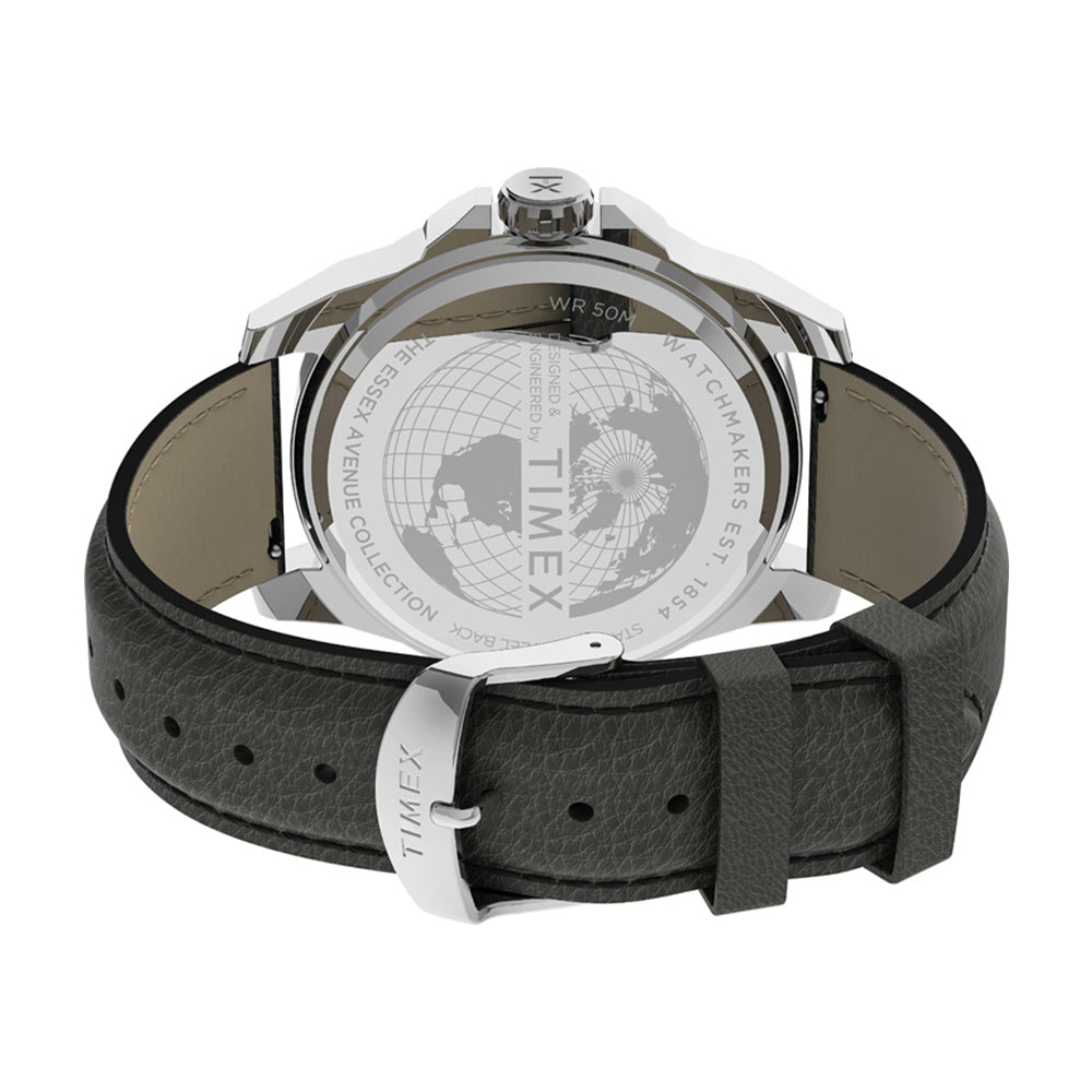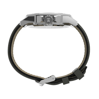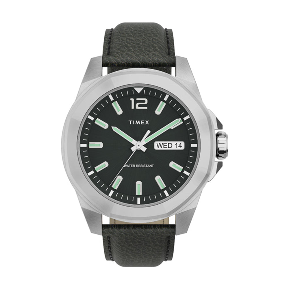 Our legendary durability comes to life with a modern analog watch that looks like it can take a licking and keep on ticking. The octagonal top ring and crown protector complete an oversized 44mm silver-tone case that is water-resistant up to 50 meters and is paired with a green natural leather strap.