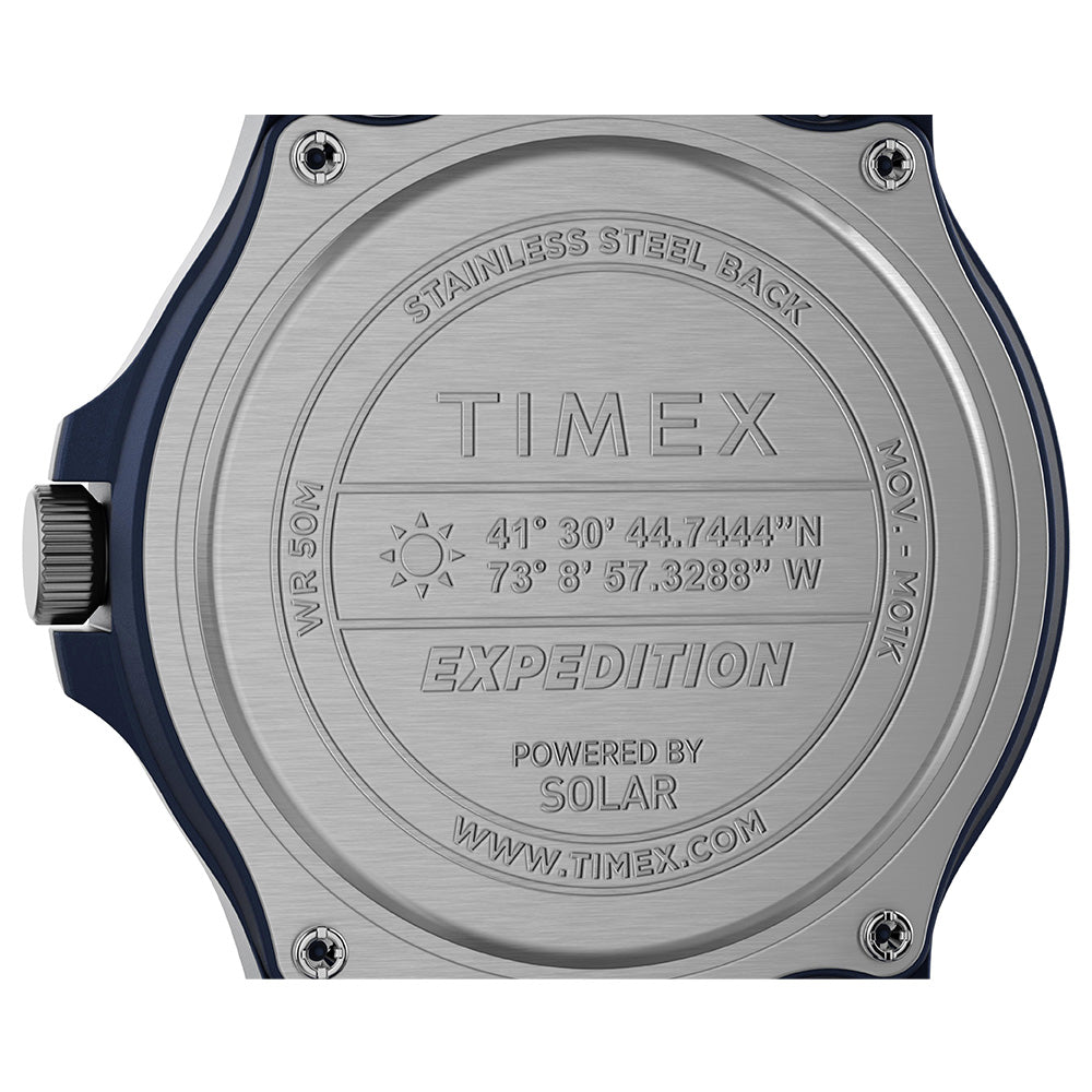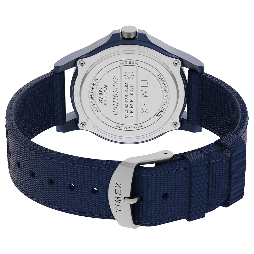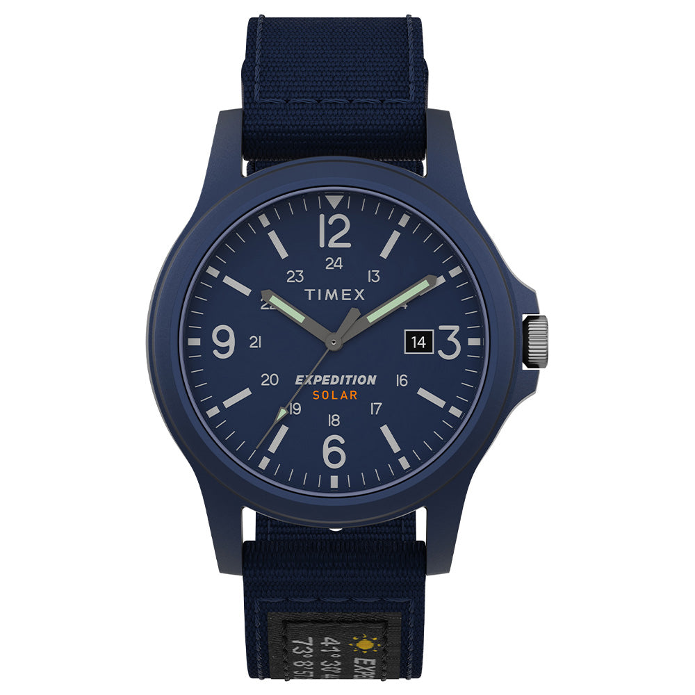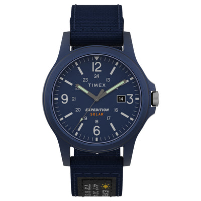 Charged by any light with a four-month power reserve, our Expedition Acadia Solar is a sustainable timepiece powered by natural energy and ready to handle whatever life throws its way. This solar-powered watch is built for the great outdoors with its blue fabric strap, 40mm blue resin case and blue dial.