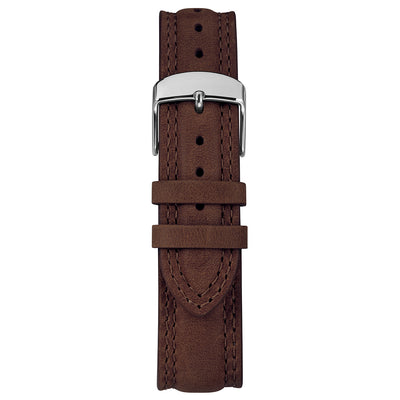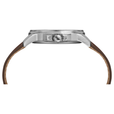 Ideal for daily wear with water resistance up to 50 meters, this Expedition metal field watch features a durable 40mm silver-tone case, blue dial with luminous hands and numbers and a brown leather strap.