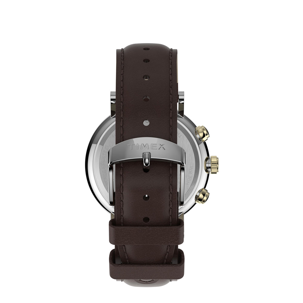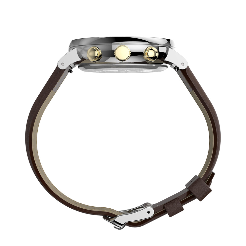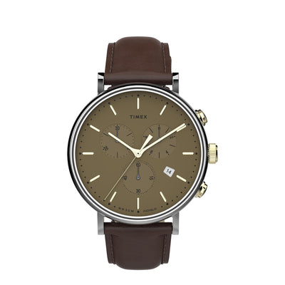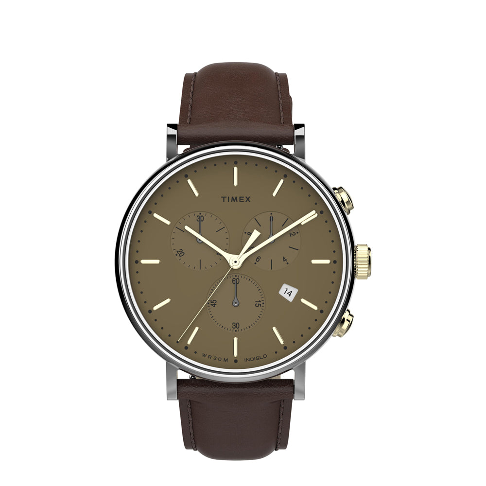 Minimalist doesn’t have to mean simple; rather, the Fairfield Chronograph provides just the right touch of understated charm. This watch features a silver-tone case with gold-tone accents, khaki dial and brown leather strap.