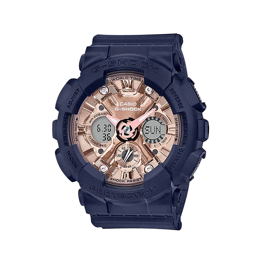 Base model is the GMA-S120, and the subdued case colors of this new model is accented by glittering pink gold accents. The index, dial of the GMA-S120MF are done in pink gold. The result is color combinations that go great with today’s athleisure fashions and other wear.