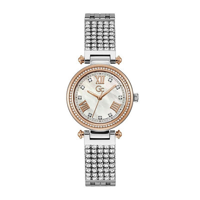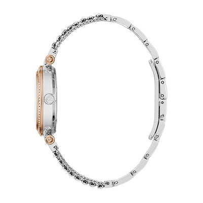 Turn up the glitz with this two-tone rose gold and silver jewellery-style ladies timepiece. The full Swarovski bezel of this watch is adorned by a white mother-of-pearl dial with Swarovski indices, complemented by a sparkling silver mesh bracelet set with crystals from Swarovski®.