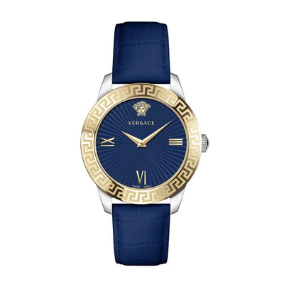 This iconic symbol of Versace is the hero of the entire construction: tone-on-tone, it crosses the enamel or mother-of-pearl dial, along the length of the strap to the top ring.