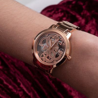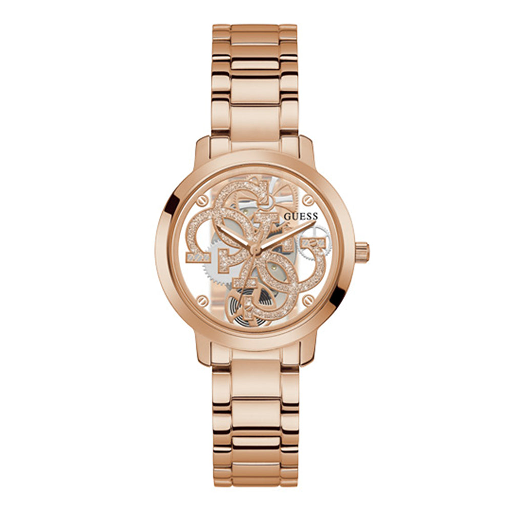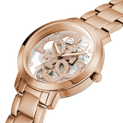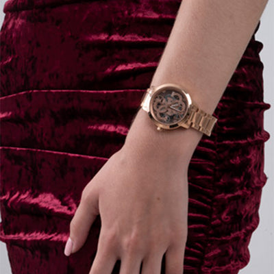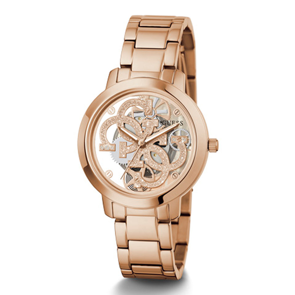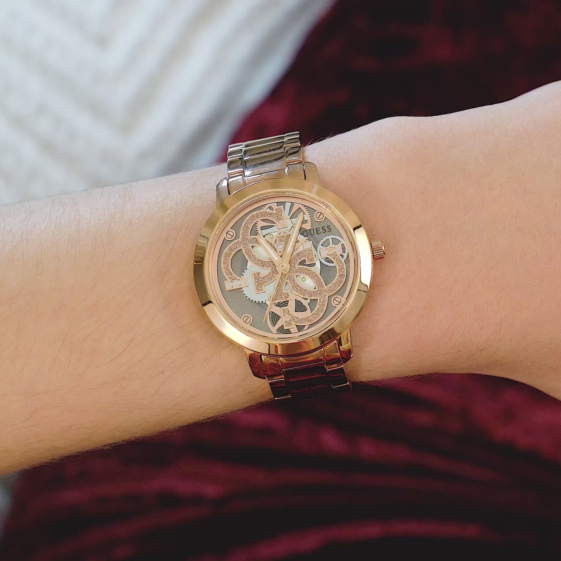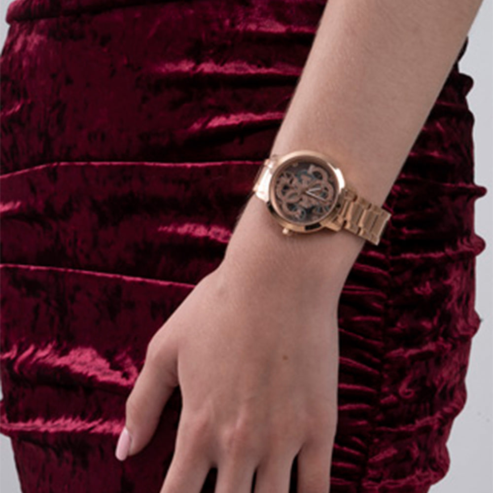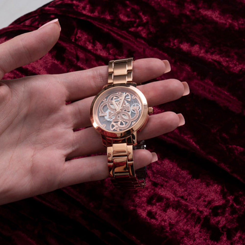 This watch makes head turn with its see-thru dial with the iconic Quattro G logo. Also comes with polished bracelet in rose gold tone.