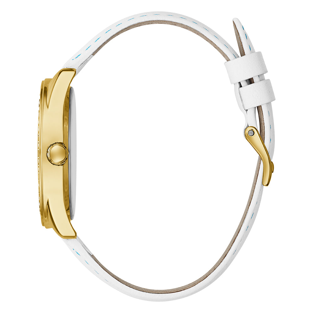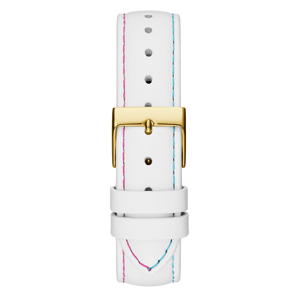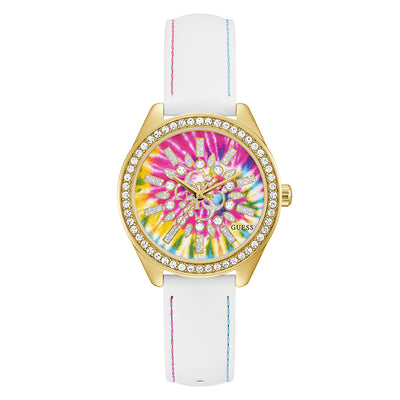 Bring the sunshine to your wrist with this vibrant accessory. This watch radiates with its full crystal gold case and an ombre tie dye dial with quattro g embossed GUESS logo that pairs effortlessly with coordinating silicone strap.