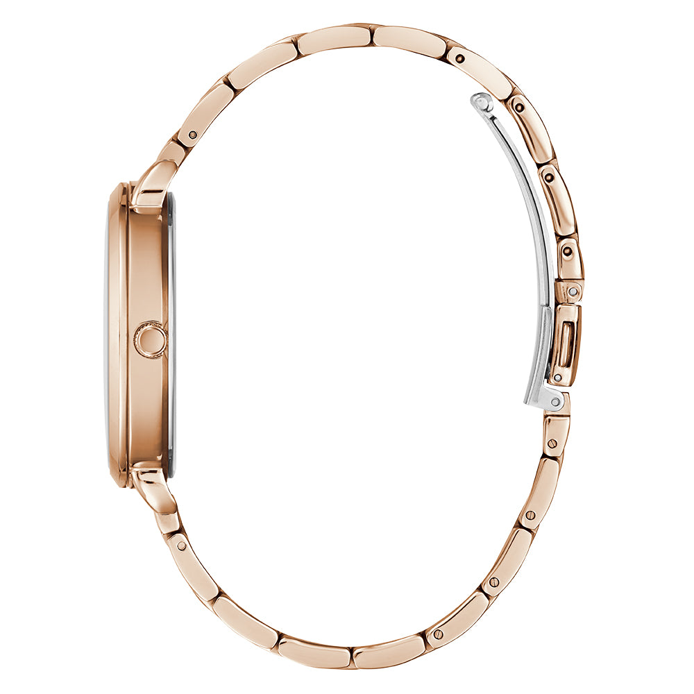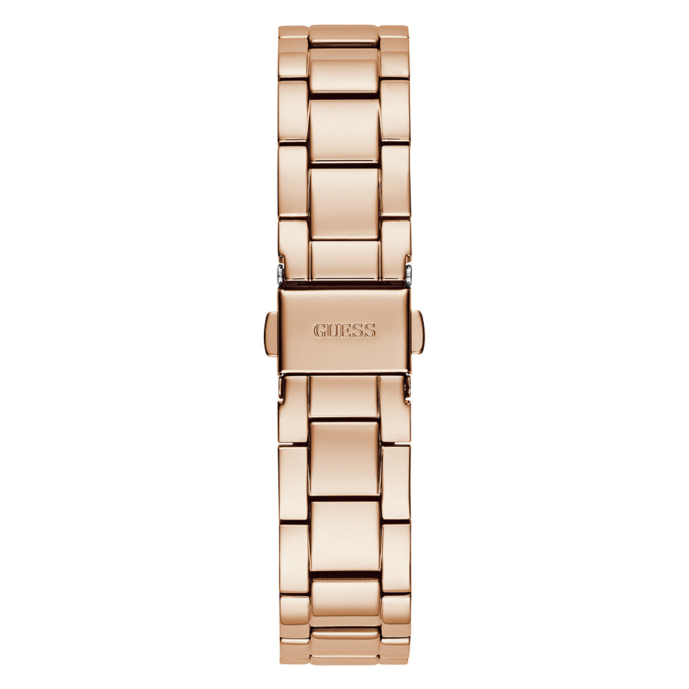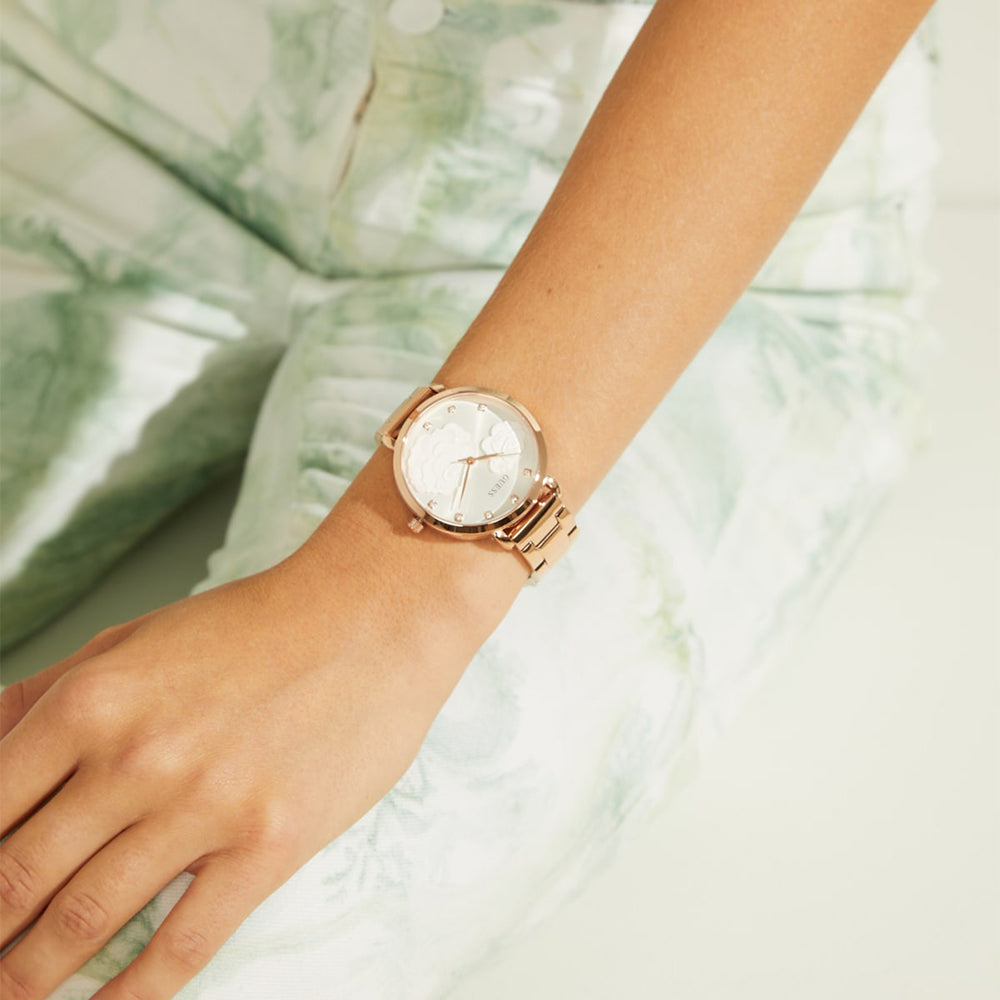 An elegant rose gold timepiece that features a floral dial and genuine Swarovski crystal markers.