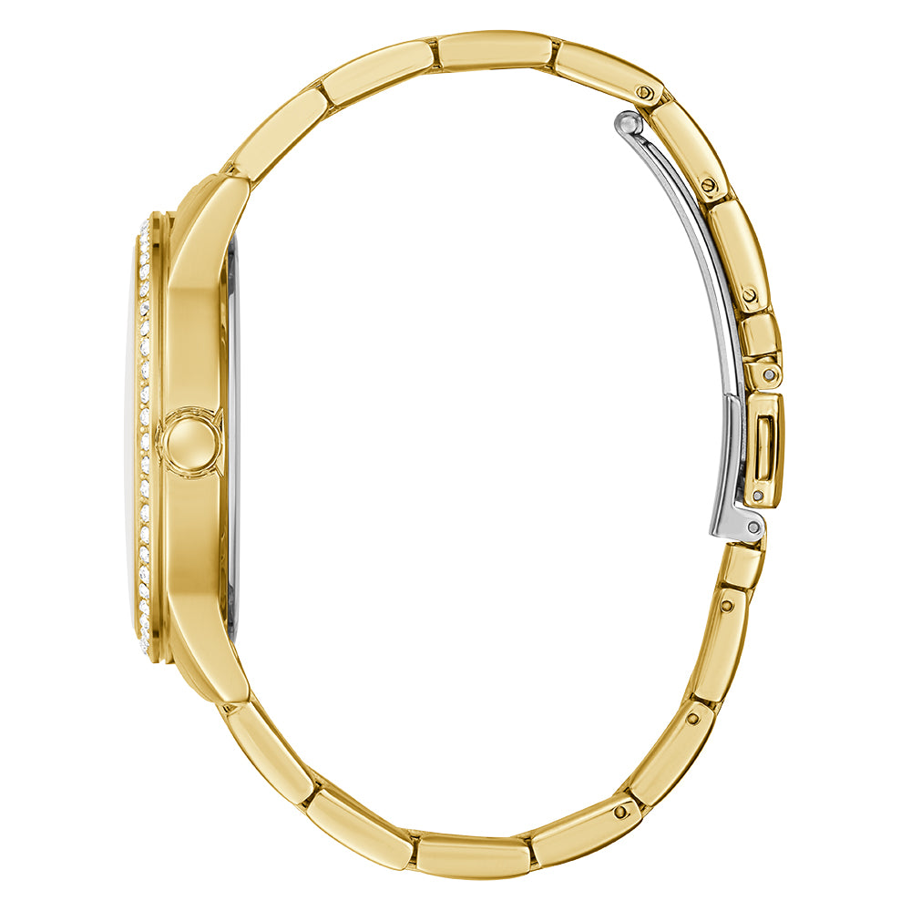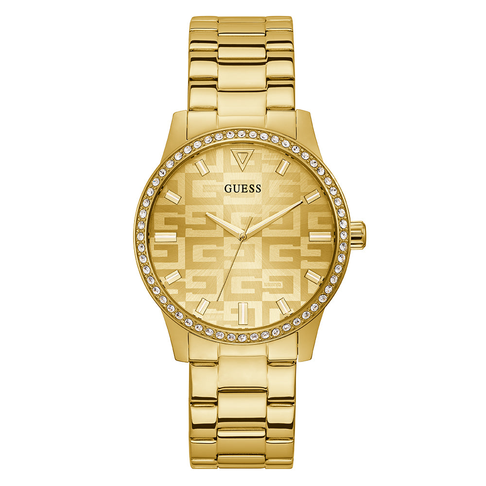 A signature silhouette that features a full crystal case and repeating square G logo dial on a 3-link gold bracelet