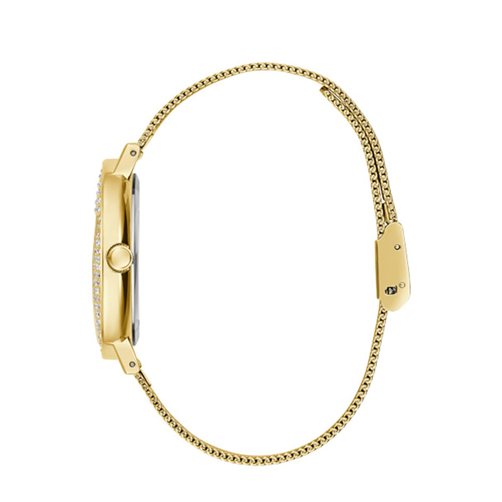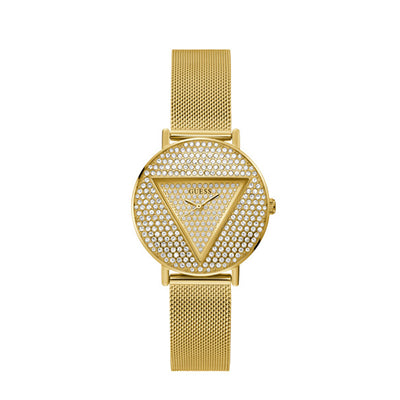 Iconic in everyway, this dazzling style has a triangle dial inset with full glitz and is paired with a sleek mesh bracelet with self-adjustable links