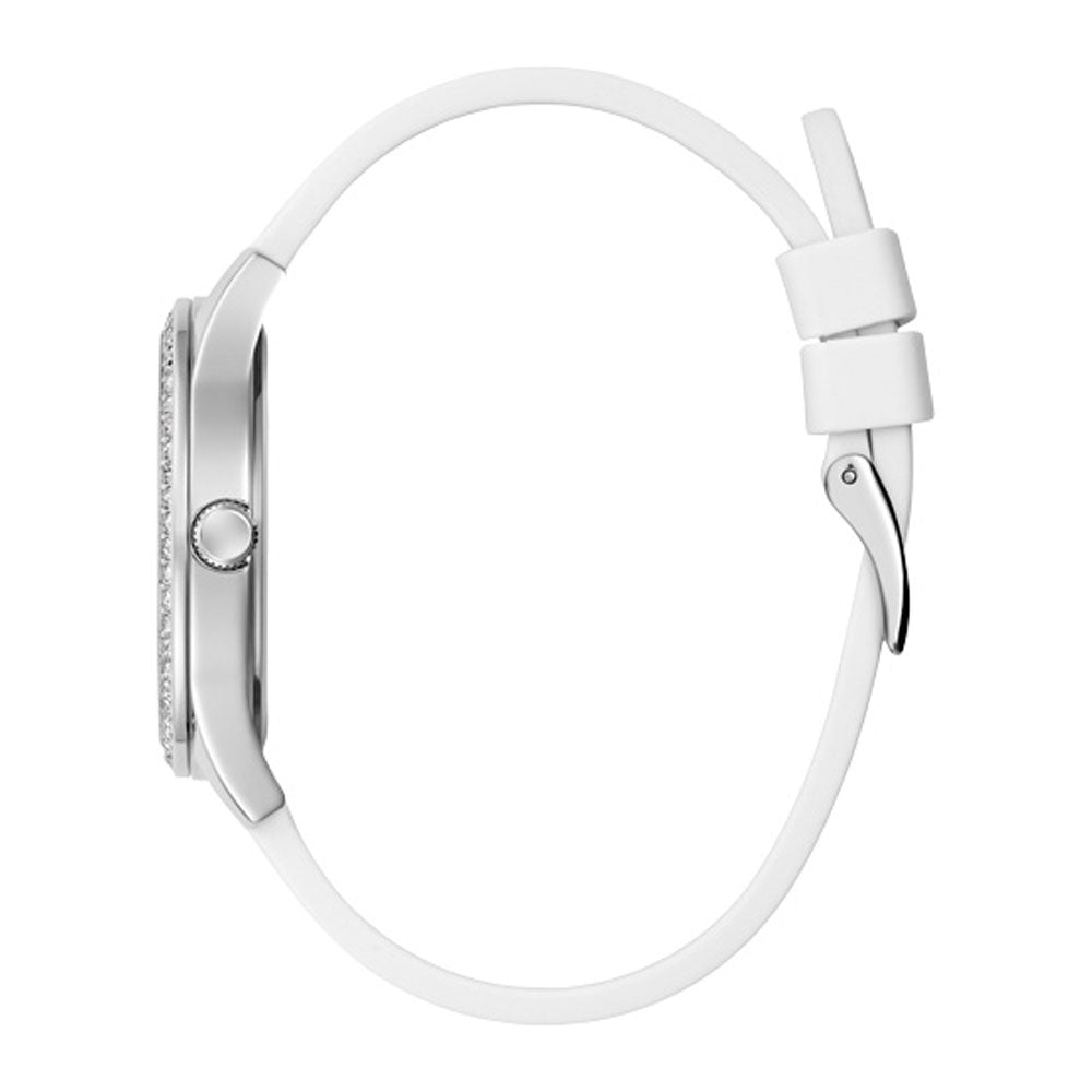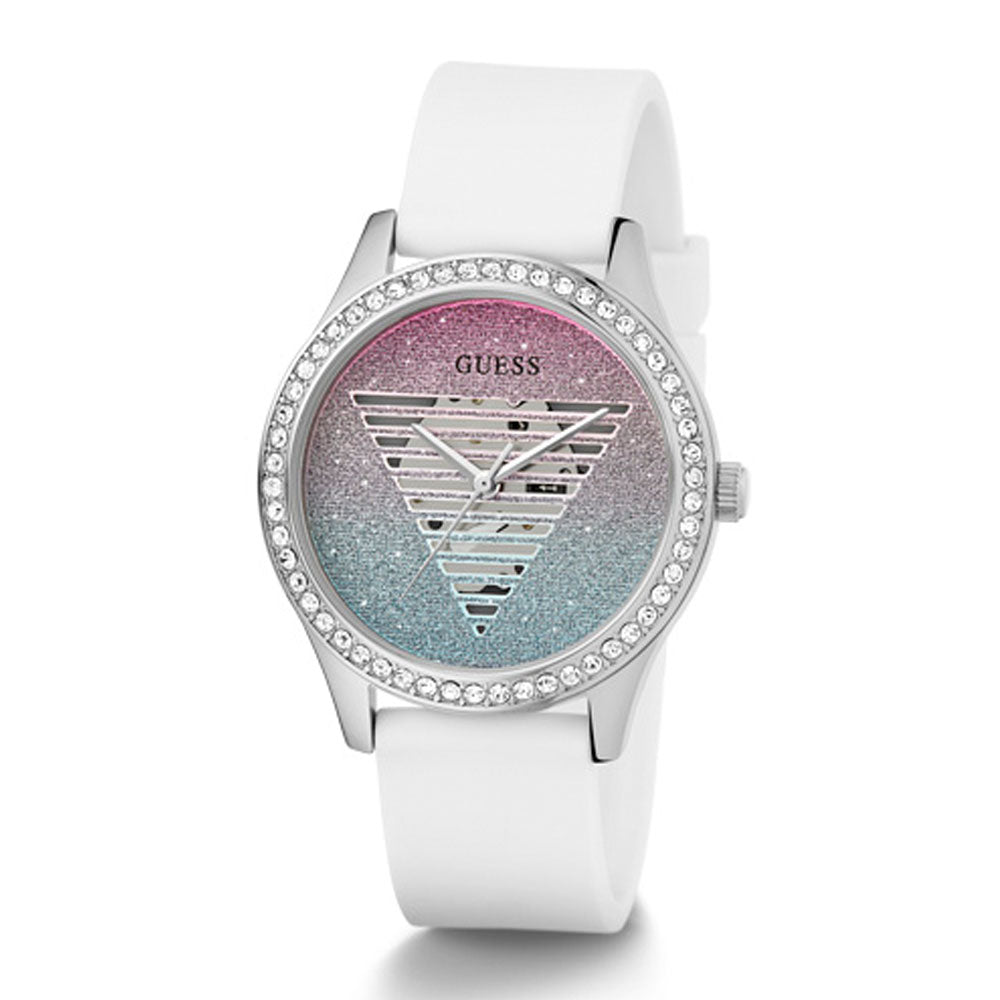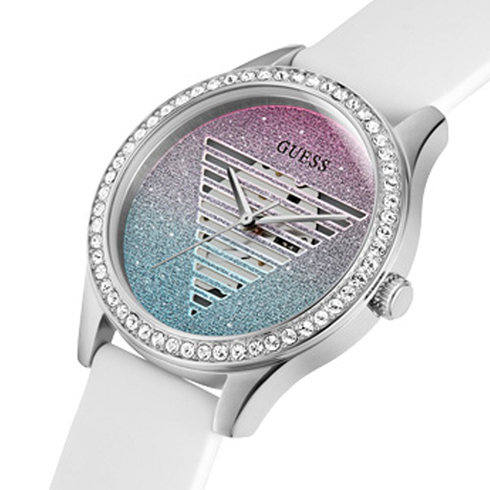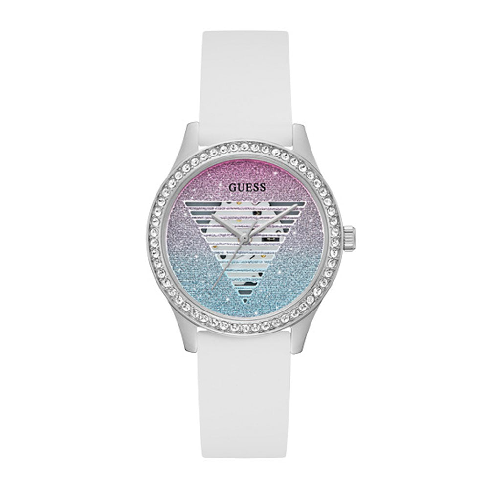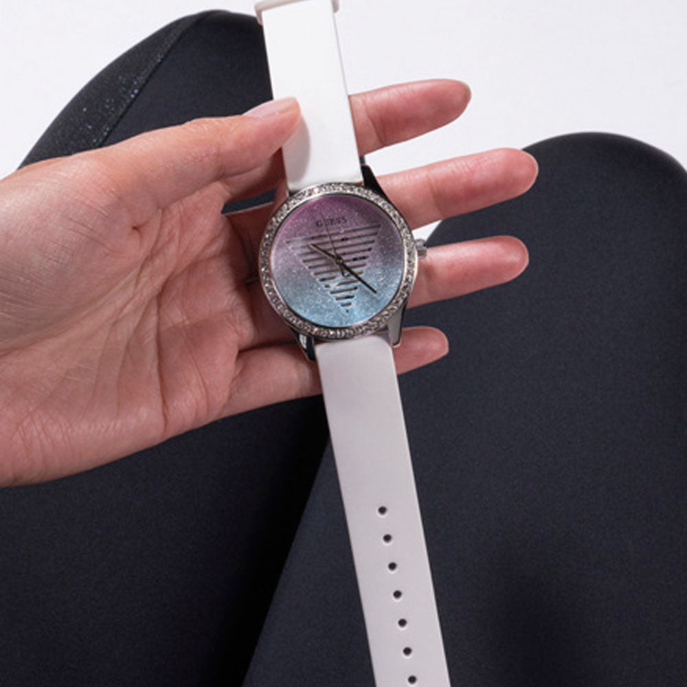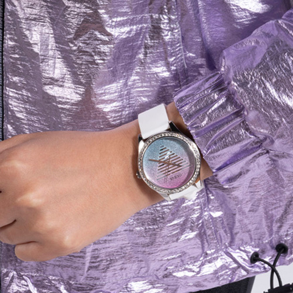 A fashionable timepiece that accentuates an elegant style. The shield's multi-colored form dazzles, while the crystals embellish the silver steel envelope, and the elastic white silicone strip connects the entire body.