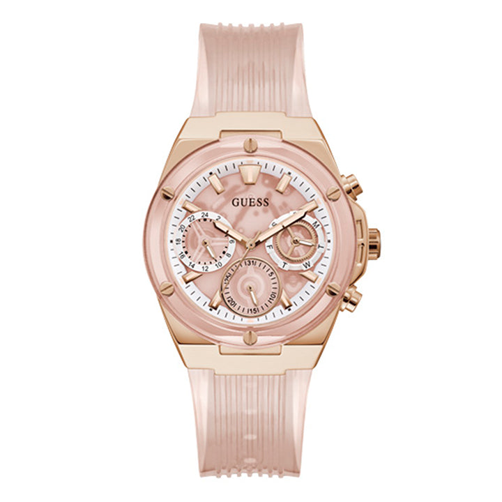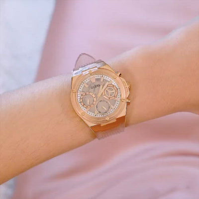 Sport meets Glam with this versatile chrono-look style featuring a nylon top ring that is made from 45% bio-based materials and a strap that is 49% bio-based