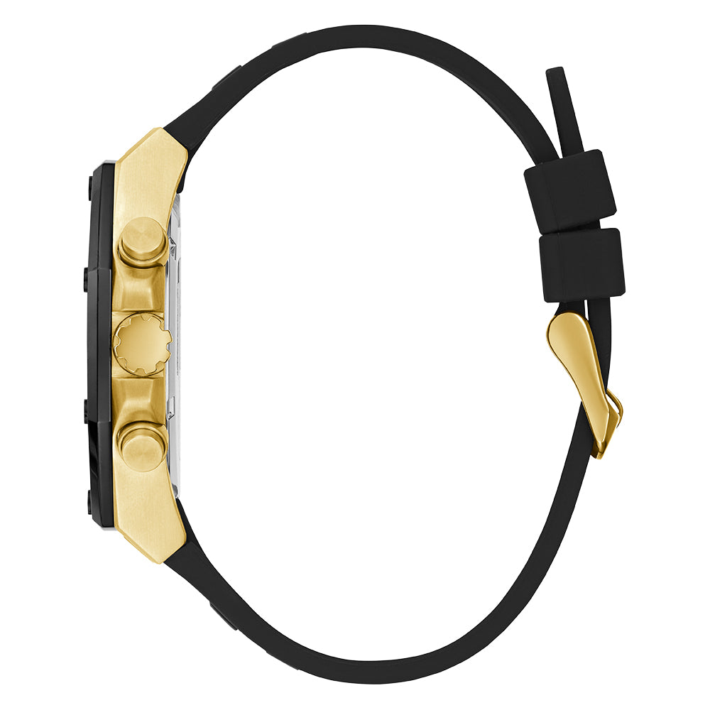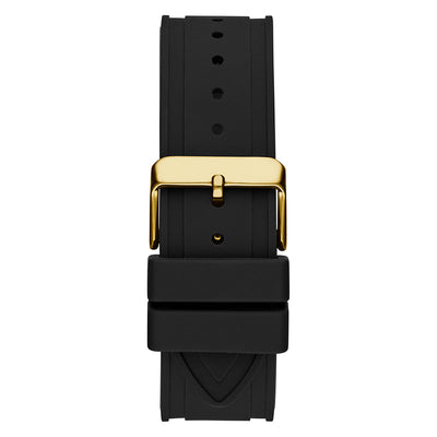 A watch that gives you the momentum to propel through your day. A chrono-look multi-function dial with cut-thru details coordinates with a cut-thru black silicone strap.