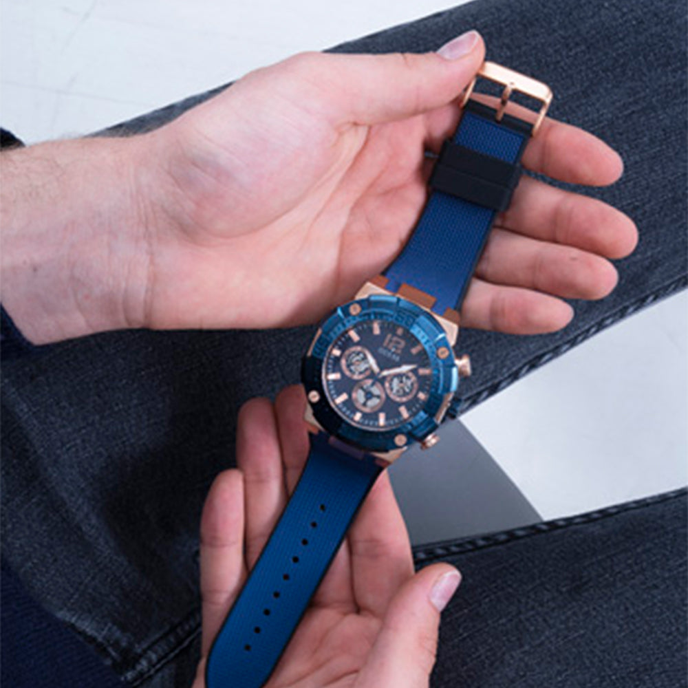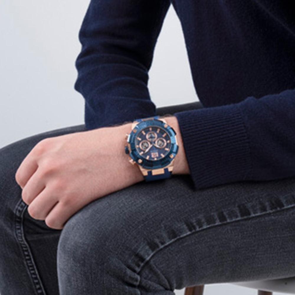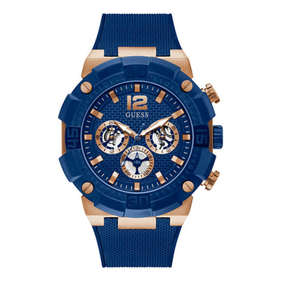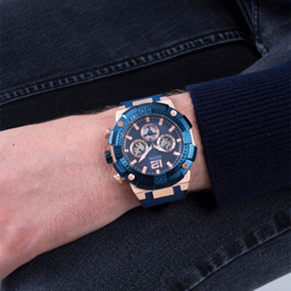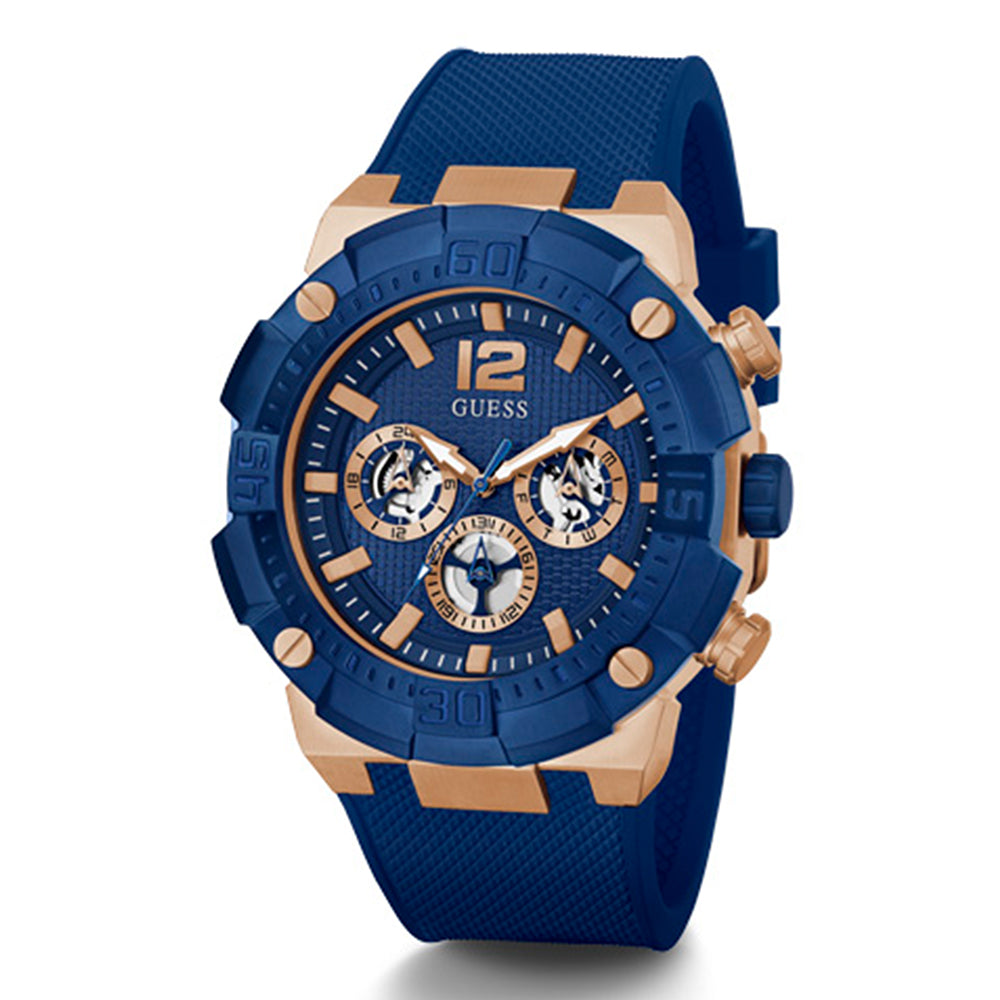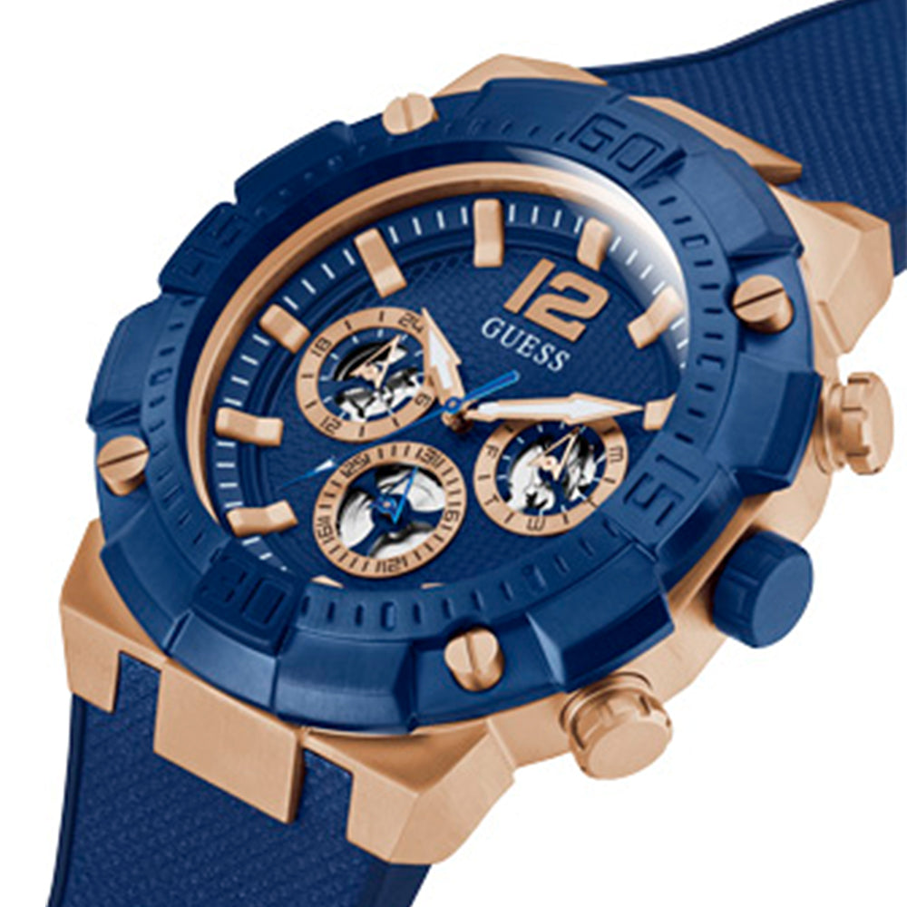 This bold men's timepiece boasts a 50 mm case size and multi-function details that outperform the competition.