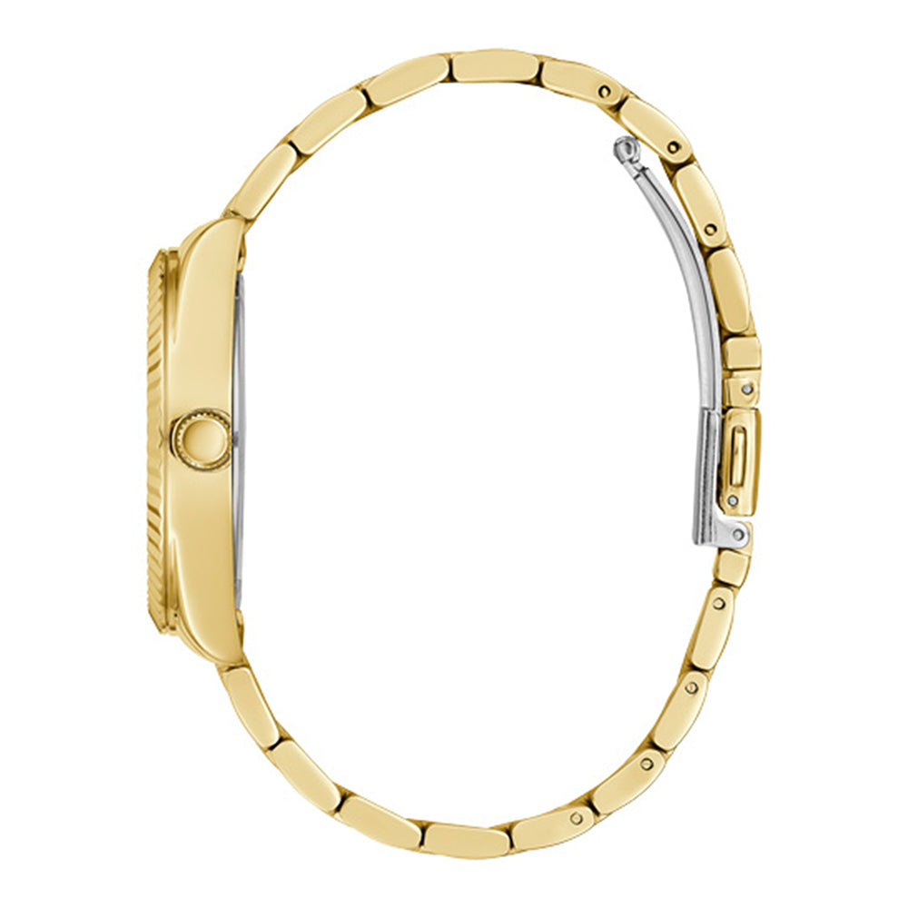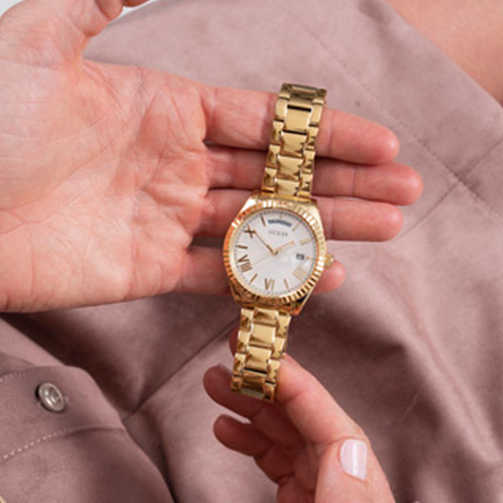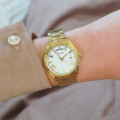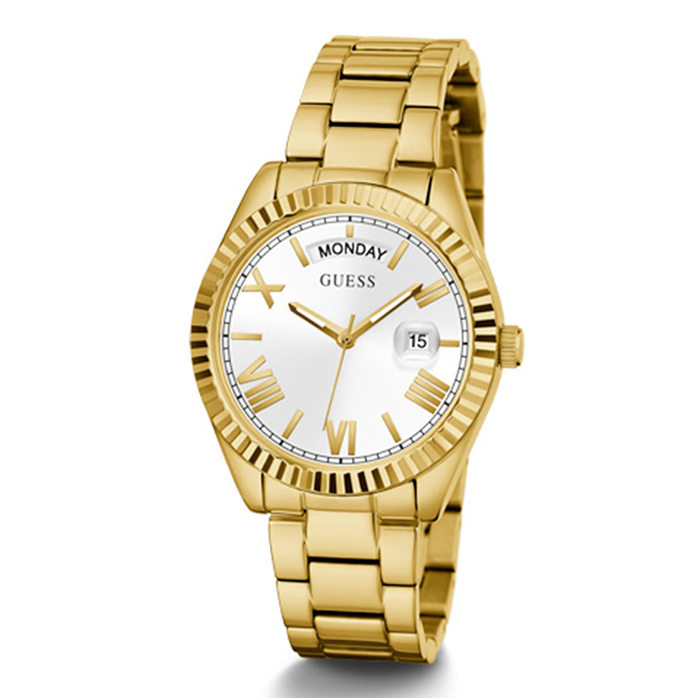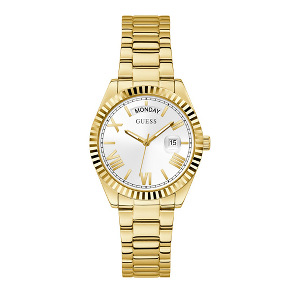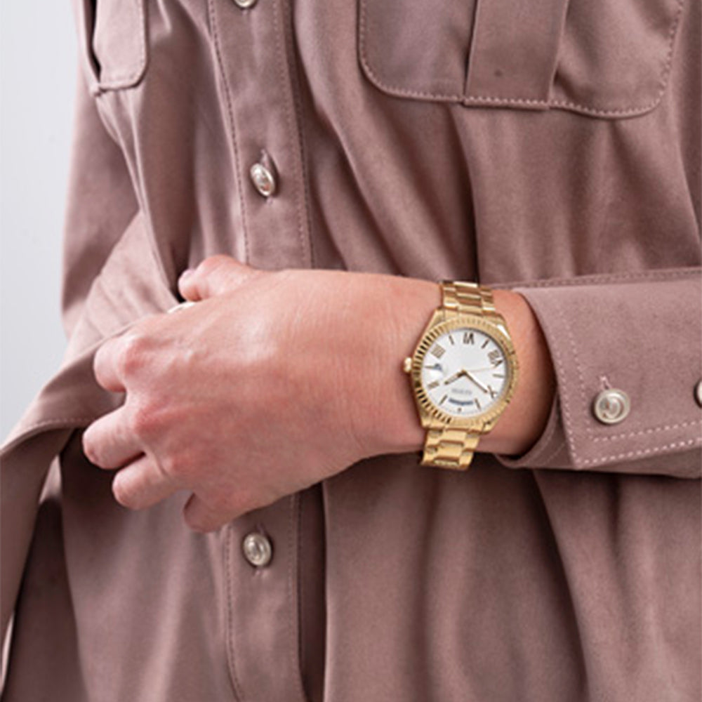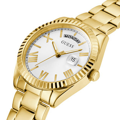 A classic look that never gets old. This coin edge bezel is integrated with a polished 3 link bracelet and features a day of the week window at the 12 o'clock hour with a bubble date at the 3 o'clock hour.
