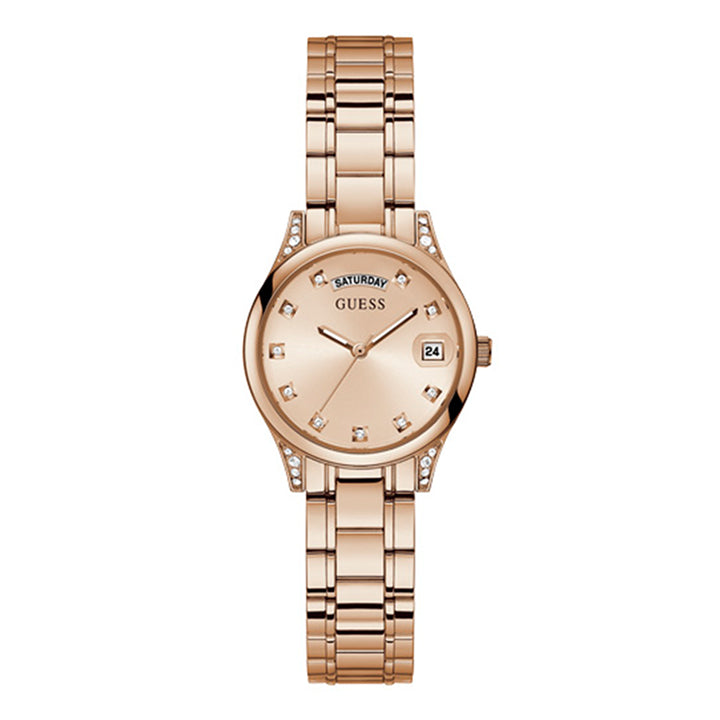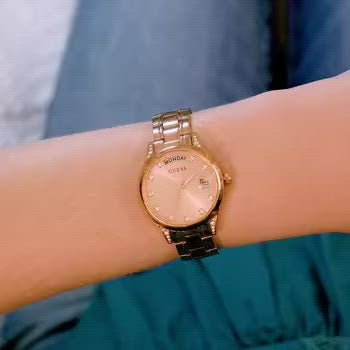 Bring the look of luxury with this elegant timepiece that features a tonal dial with a day/date function.