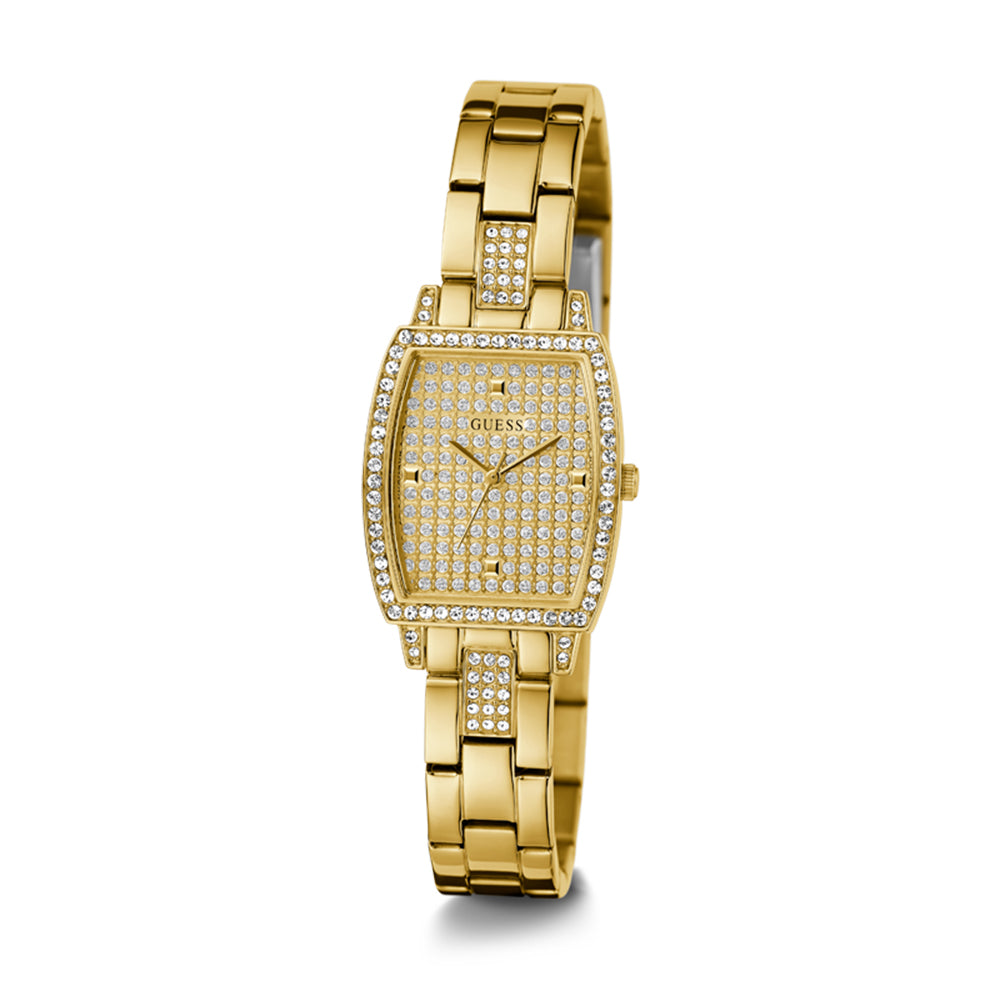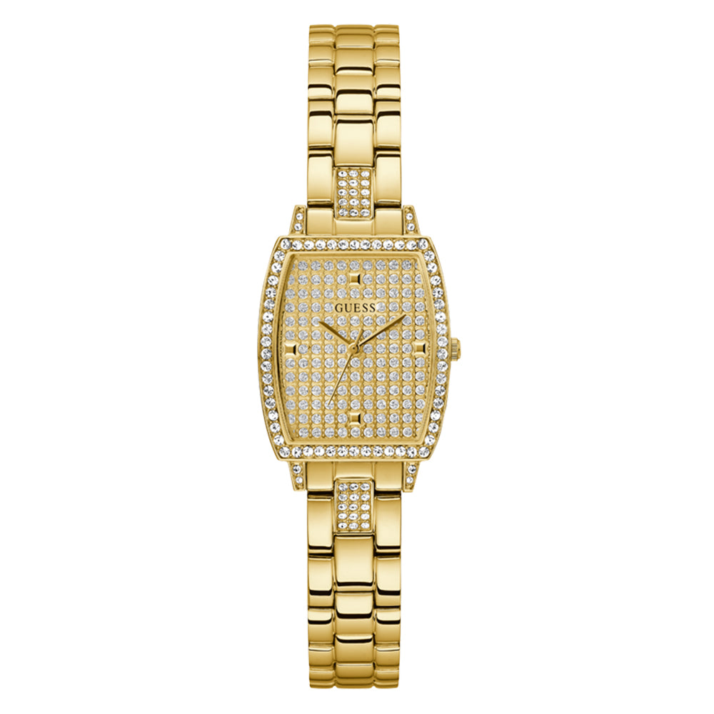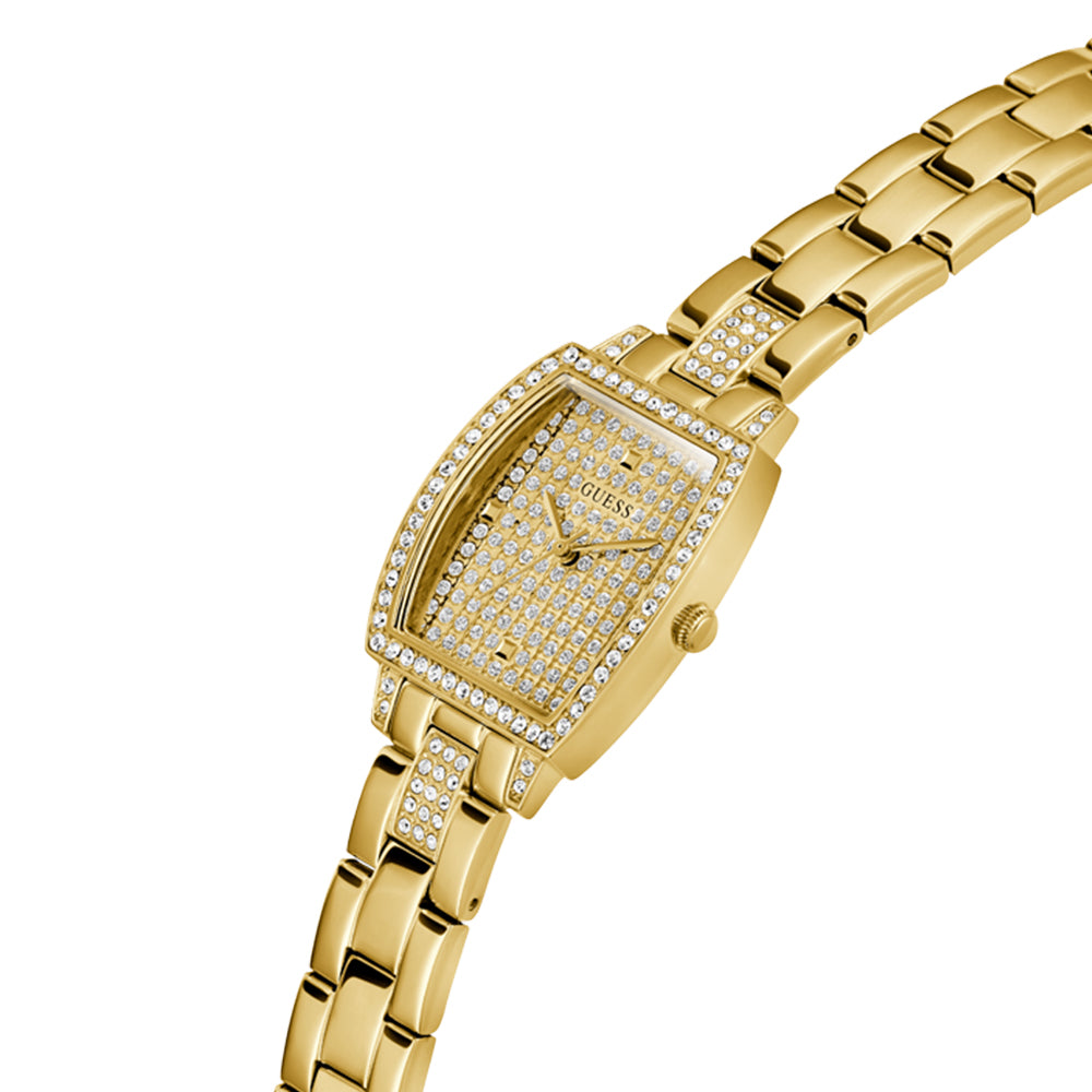 This Guess watch is sure to make you sparkle. Dazzling crystals adorn both the face and the casing, while a resilient mineral glass protects the dial. Water resistance is rated at 1 ATM.