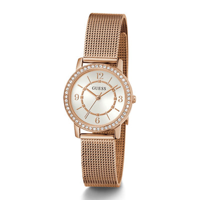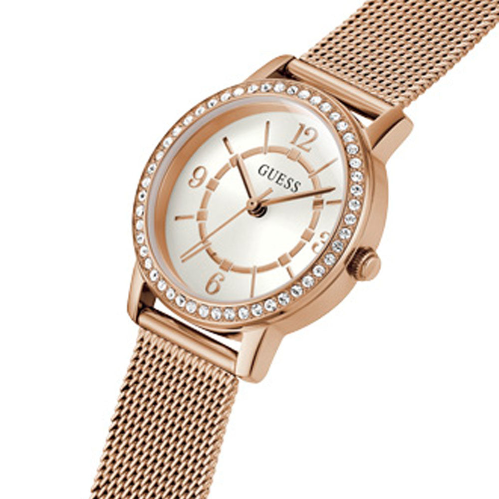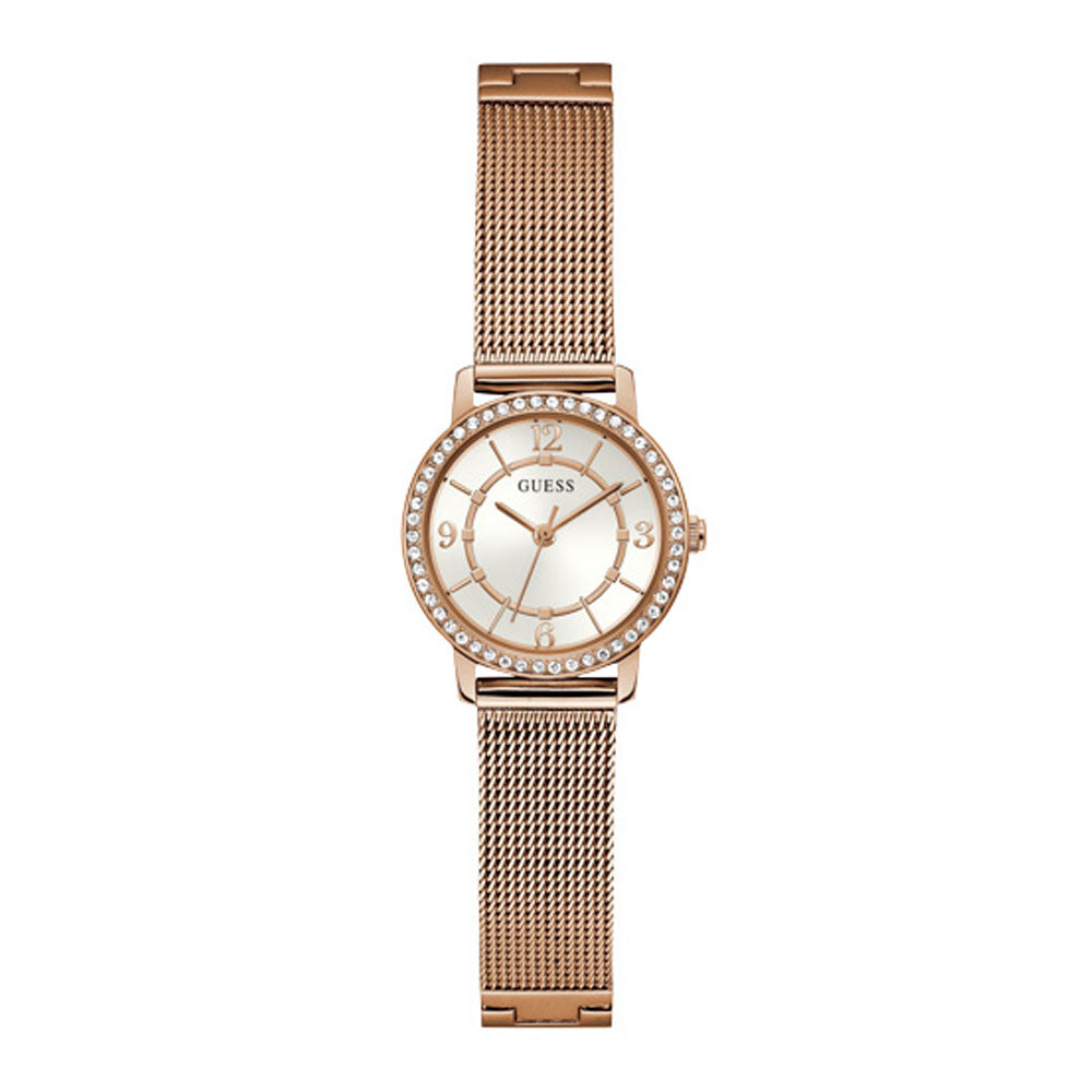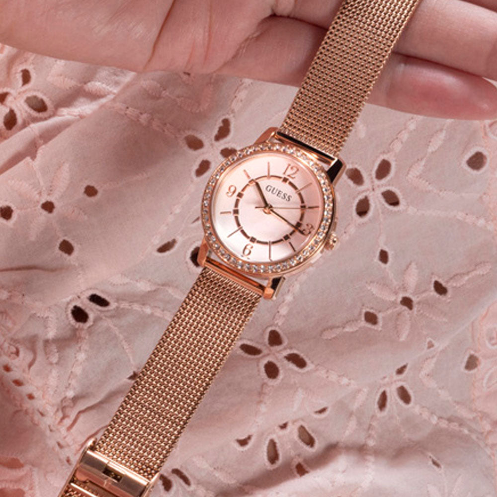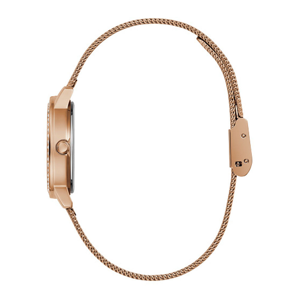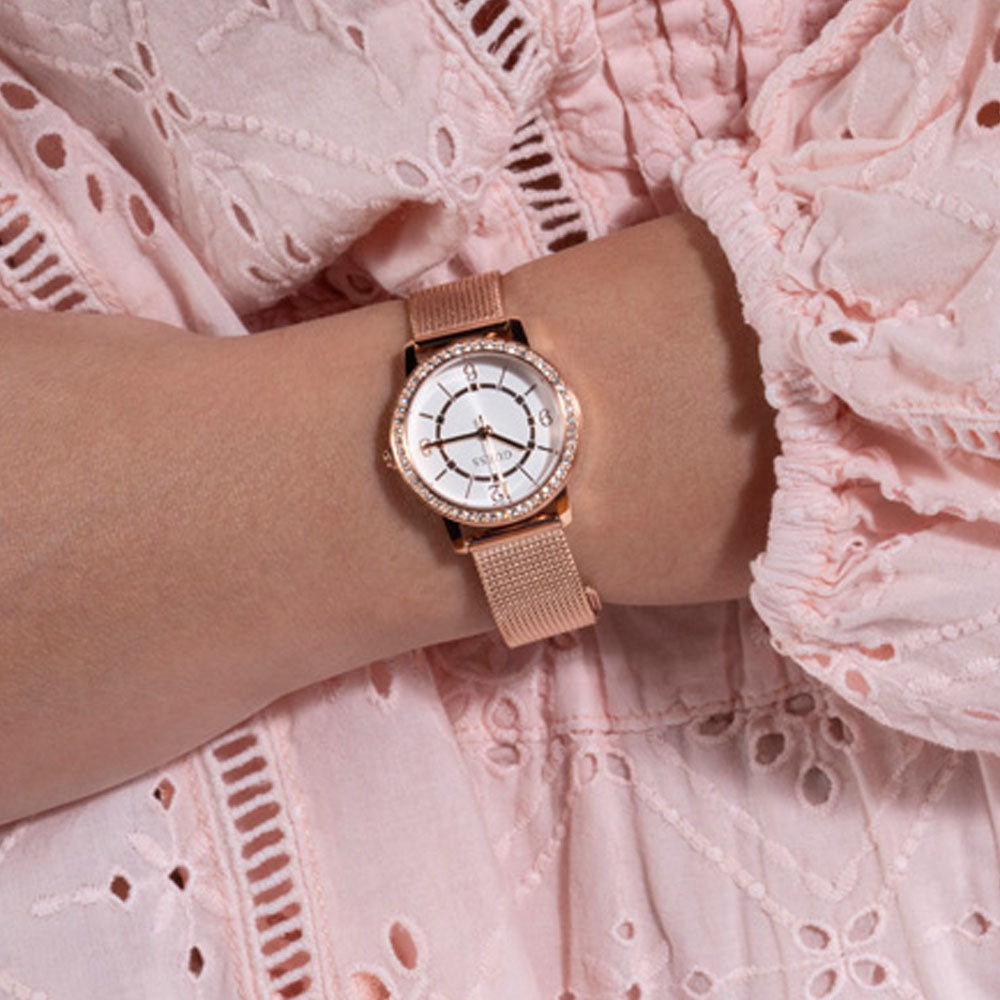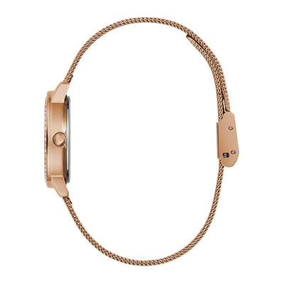 This elegant timepiece in rose gold tone has a quartz mechanism and a crystal-encrusted round envelope.