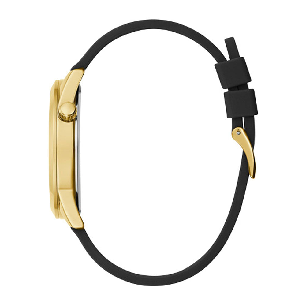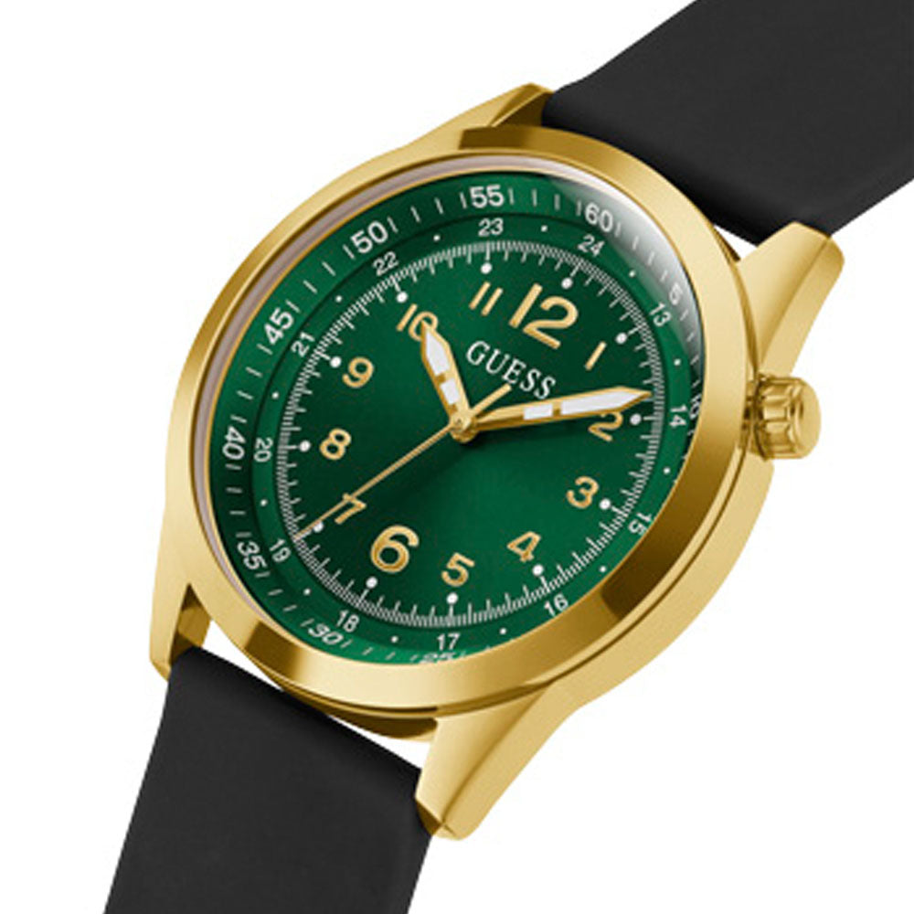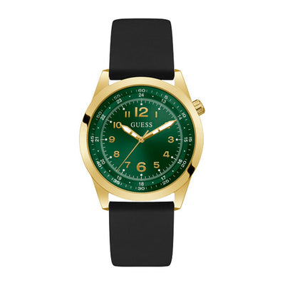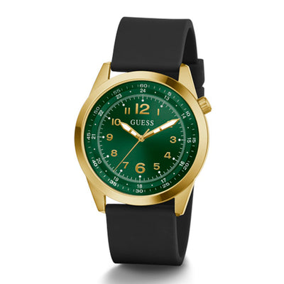 A classic look for the gents. A mineral slide was used to secure the green shield while the round envelope is attached to a comfortable black silicone strip.