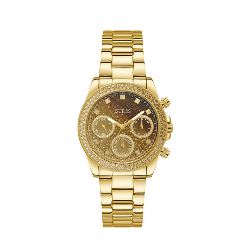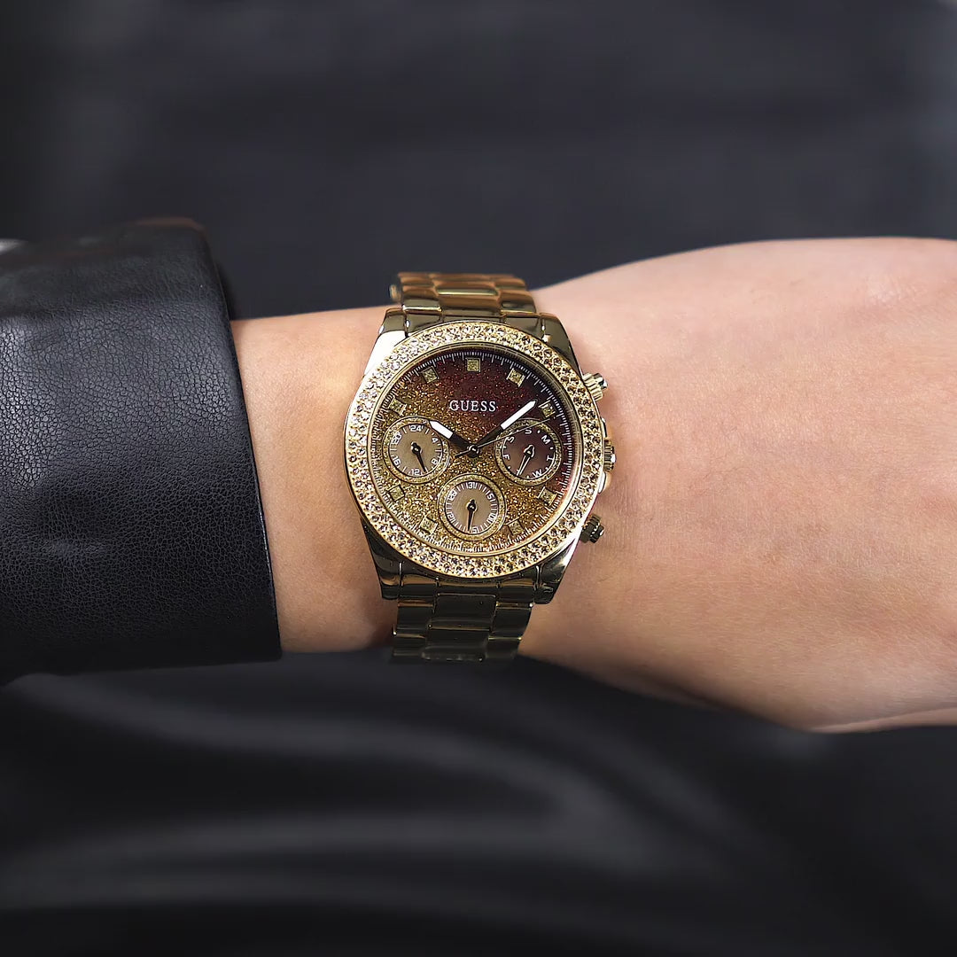 It's Ombre heaven with this double row of crystal glitz ombre top ring that transcends onto its ombre glitter dial and pairs on a sleek metal bracelet