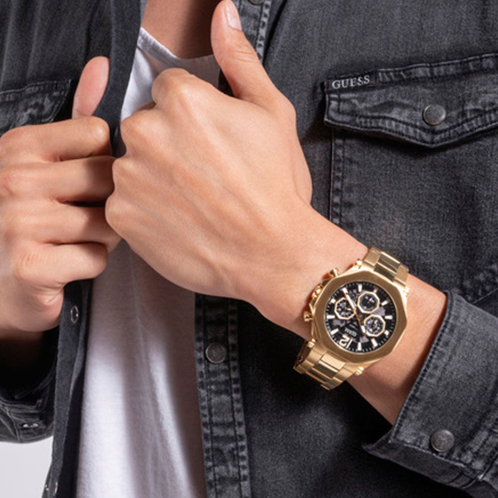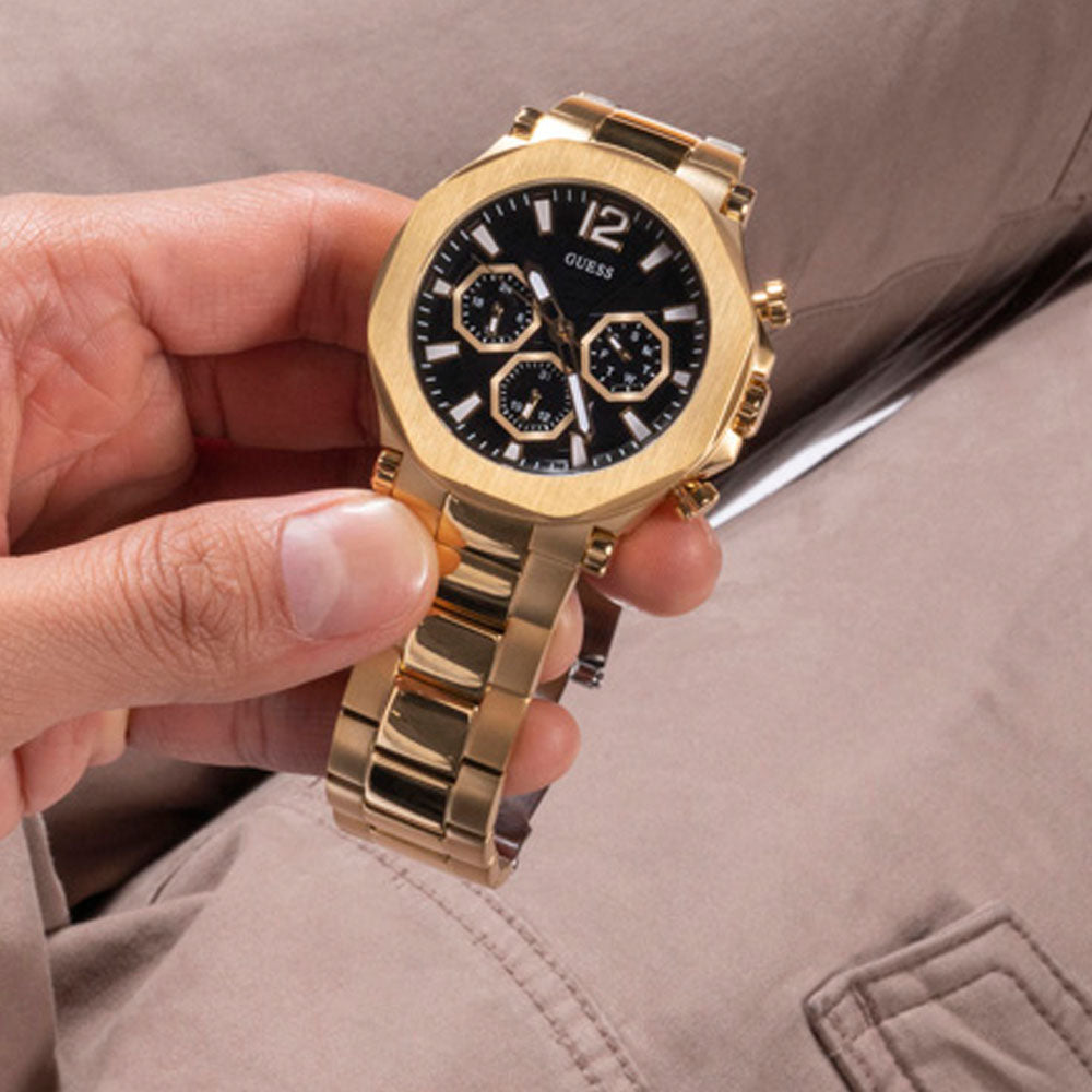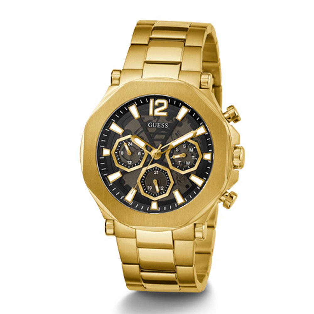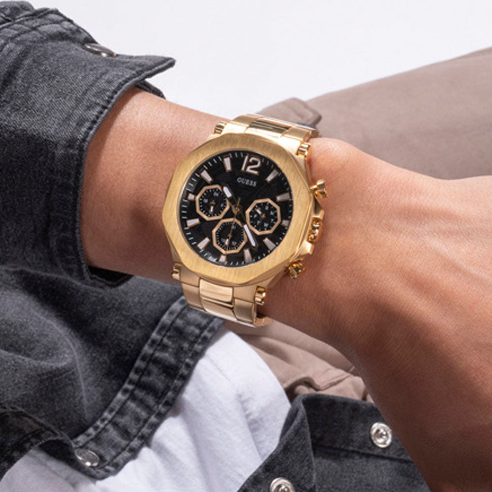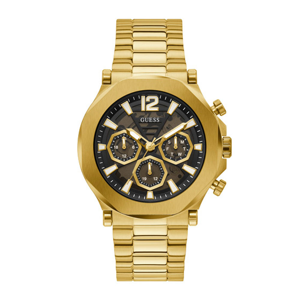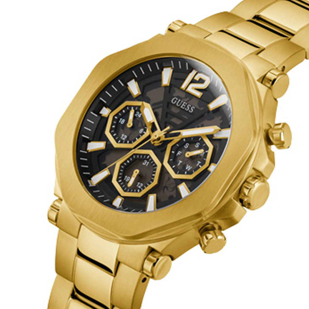 An octagonal case design with cut-thru dial details and a sleek t-bar bracelet connection keeping you on the cutting edge of fashion.