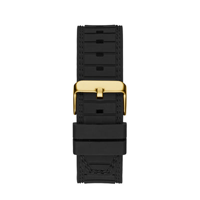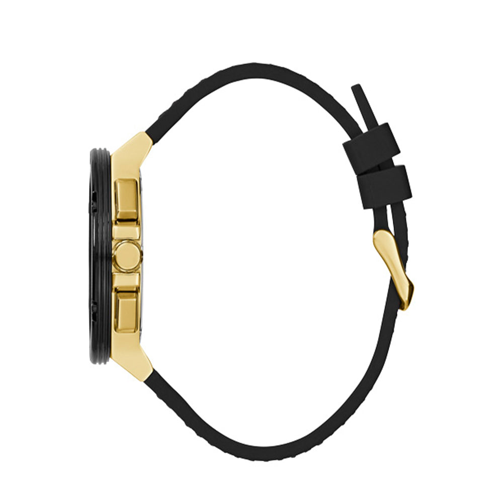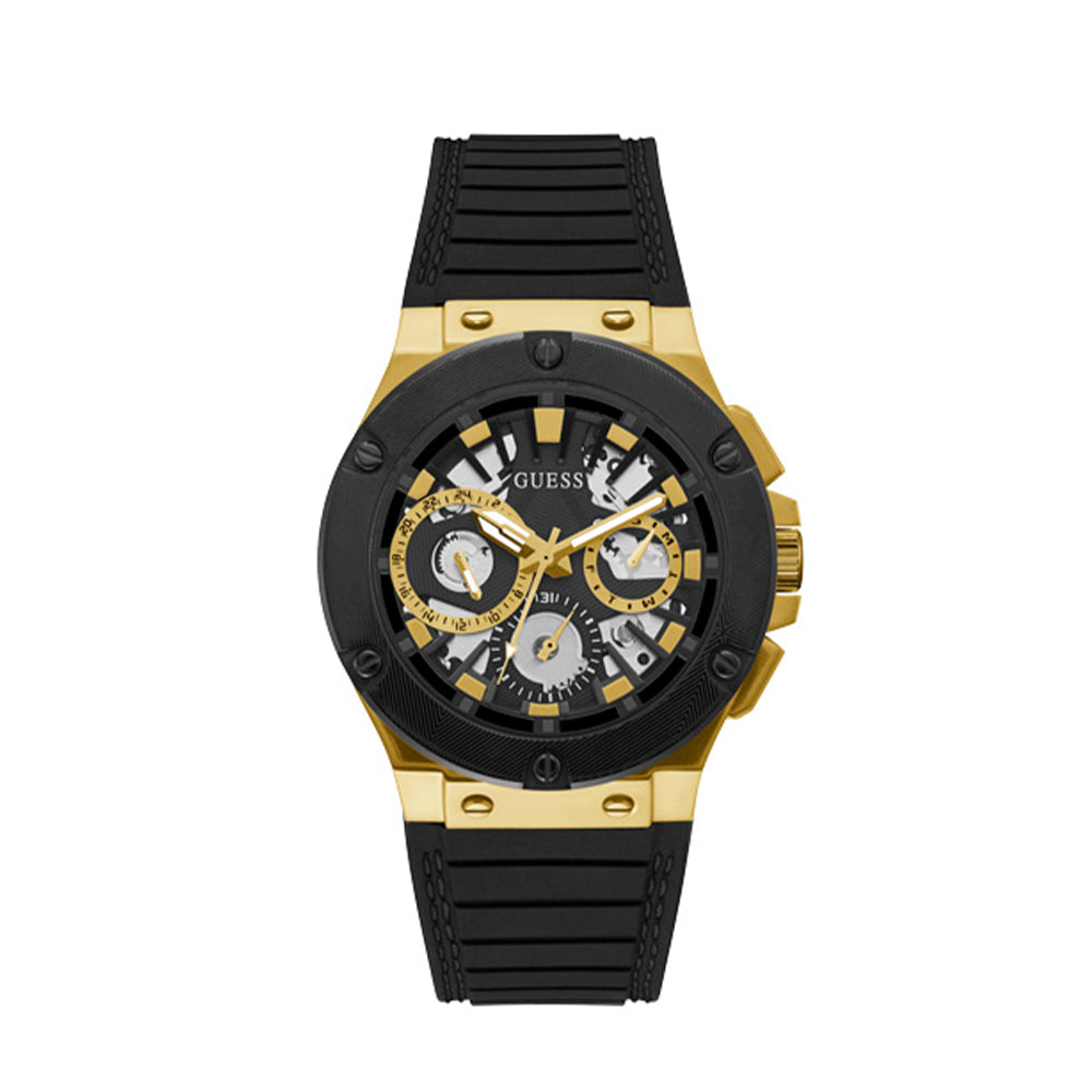 Circuit training is in effect with this bold sport look. Featuring a unique design on the top ring and screw details this style also has a cut thru design on its dial and is paired with a ribbed silicone strap