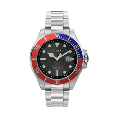 Our Harborside Coast has an elevated coastal look designed with craftsmanship and detail. We?ve paired the 100 meter water resistant, 43mm silver-tone case and black dial with a durable stainless-steel bracelet for a polished yet rugged watch. Completed with an anodized aluminum inlay on the blue and red rotating top ring, plus luminescent paint on the markers and hands, Harborside Coast is ready to set sail.