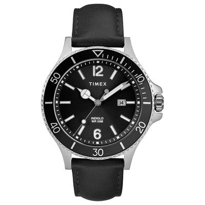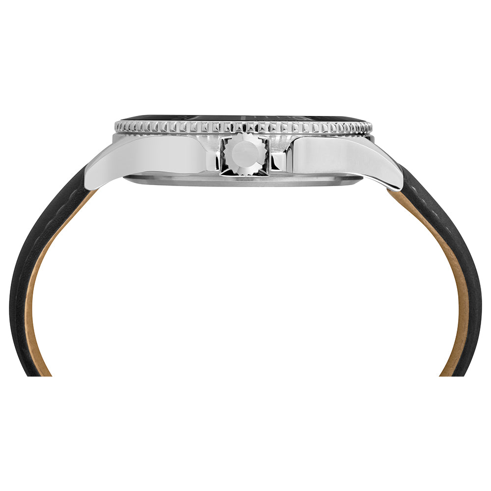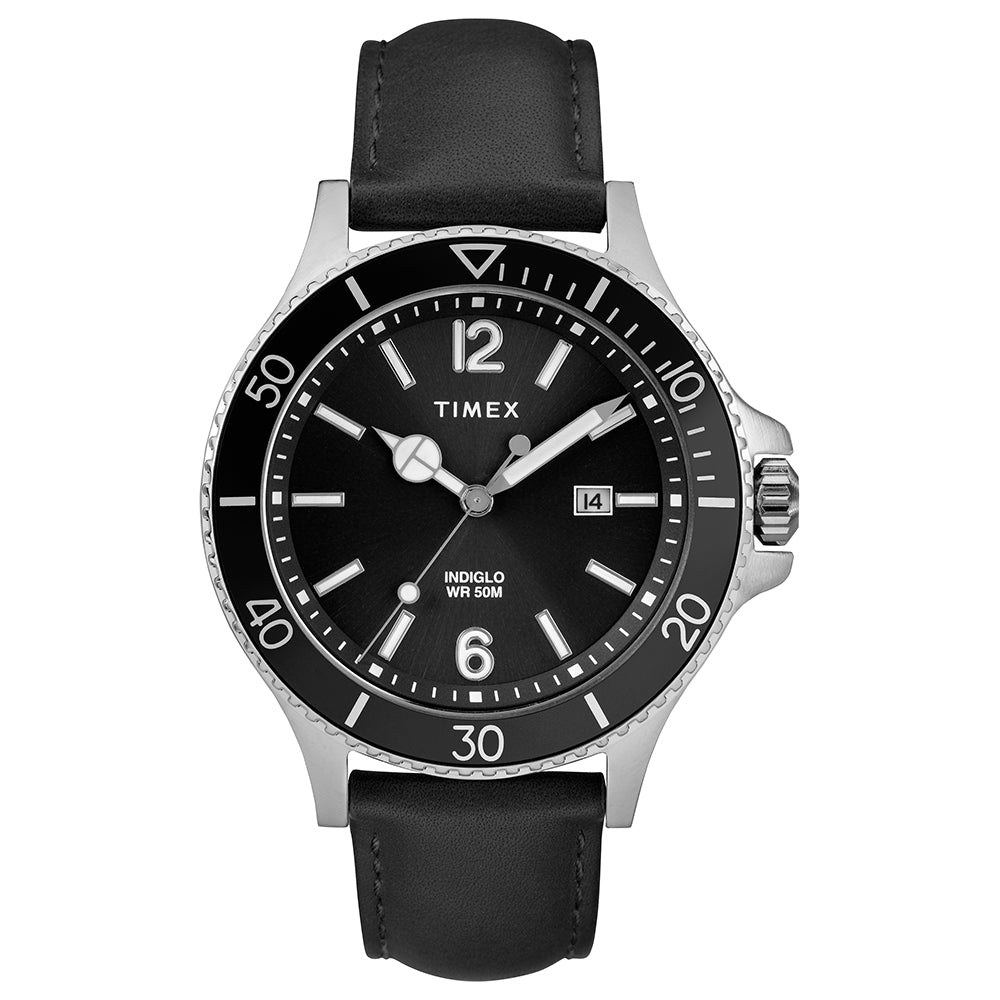 This Harborside watch was inspired by the essence of coastal living. We’ve paired the 42mm silver-tone case with a black dial and black leather strap to elevate your style with a masculine and sophisticated look.