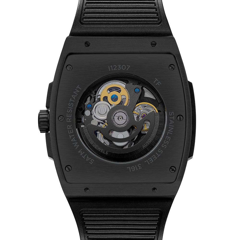 A practical yet impressive design, The Challenger maintains a quality finish without compromising on style. Boasting a black rubber strap and pin buckle fastening, this unique timepiece is complete with an exposed skeleton dial and two-tone black and silver stainless steel case in a contemporary rectangular form. A high impact watch for everyday wear.