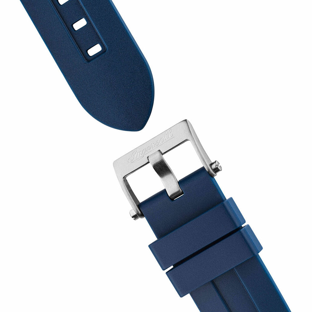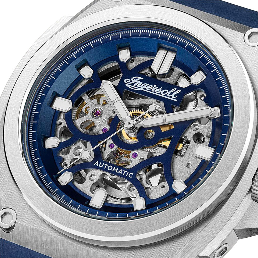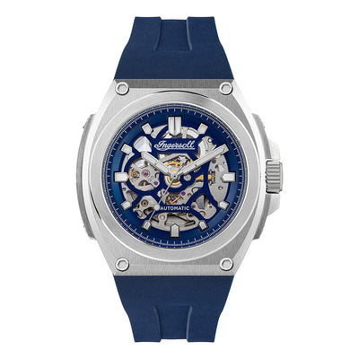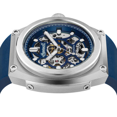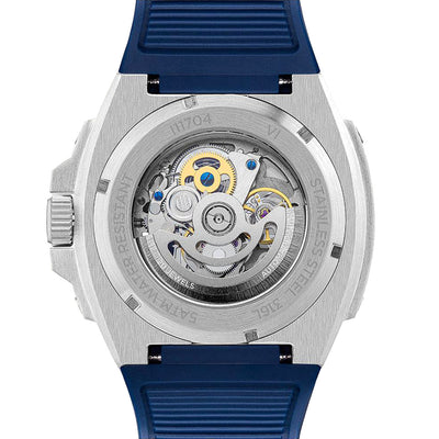 A contemporary and bold design. A luxury sports inspired watch typified by its purposeful construction and blue exposed skeleton movement finished with contrasting hands and batons. An integrated custom silicon strap completes this unique timepiece.