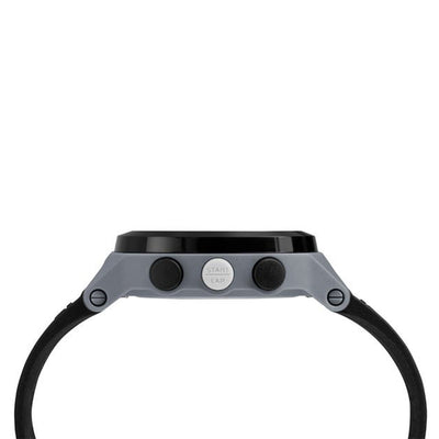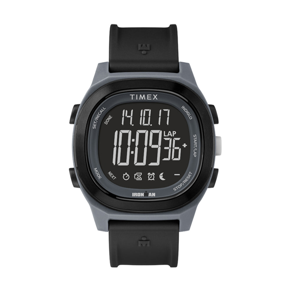 We’ve created a stylish everyday watch to match your active lifestyle. The Ironman® Transit collection has a comfortable, athletic silhouette with a gray case, black top ring and durable black resin strap for a modern-retro look. Features include a countdown timer, sports stopwatch, customizable alarm and is water resistant up to 100 meters.