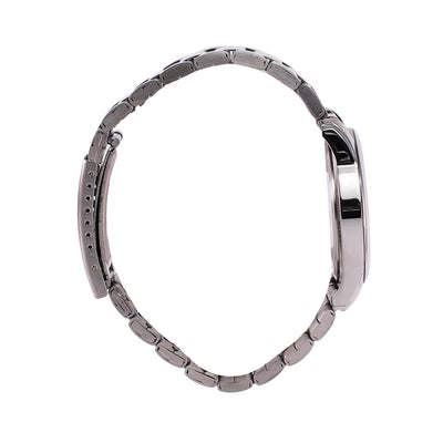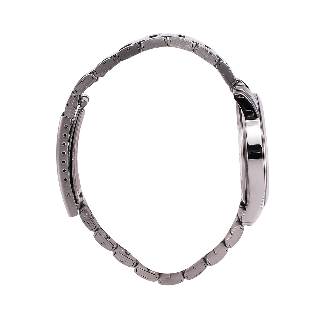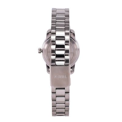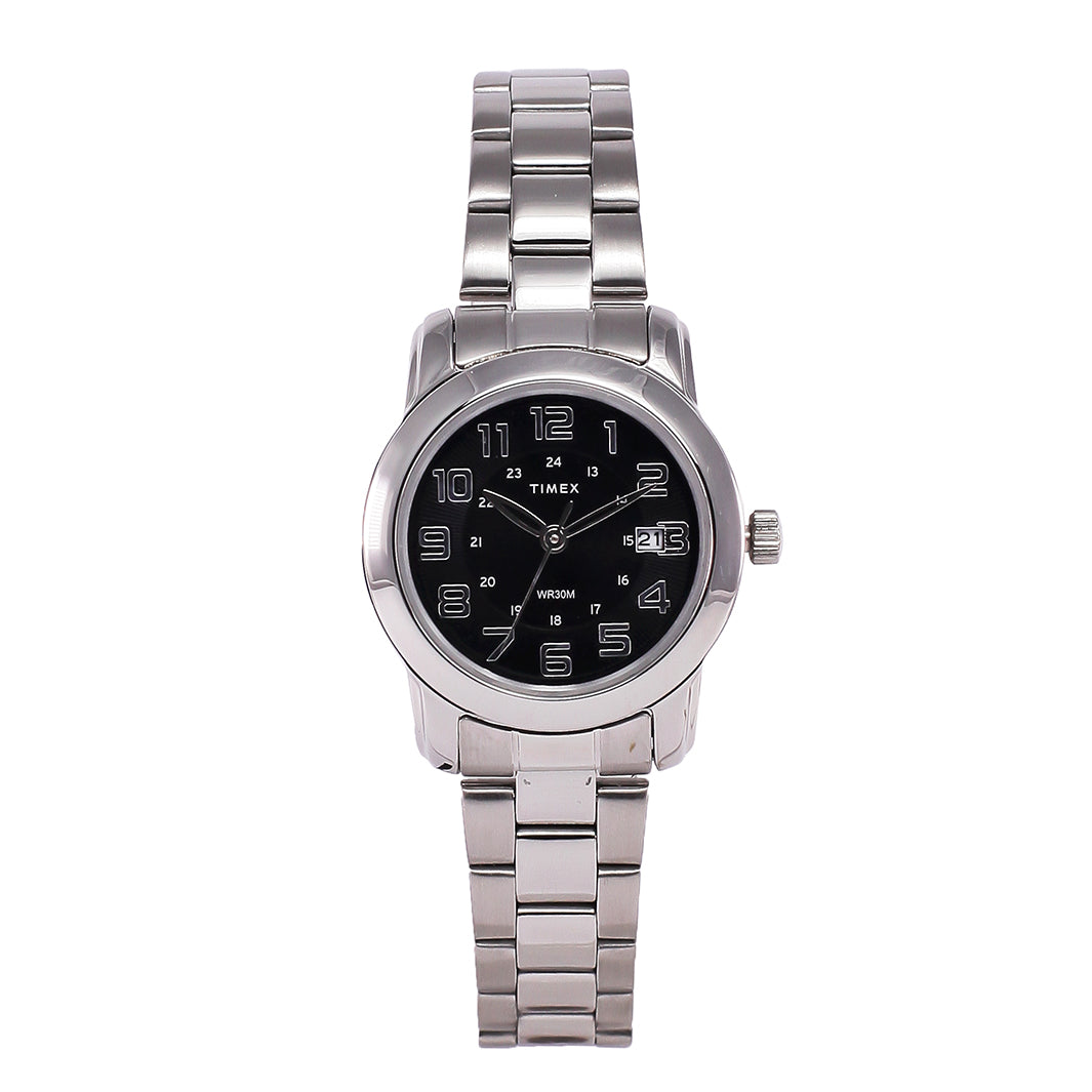 Elegant yet classic Timex watch in stainless steel, set around a high-visibility dial with large gray numeral hour markers and day-date functions.