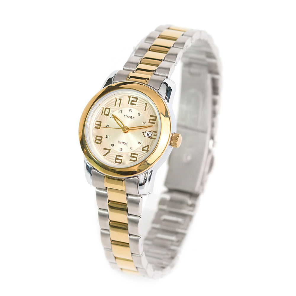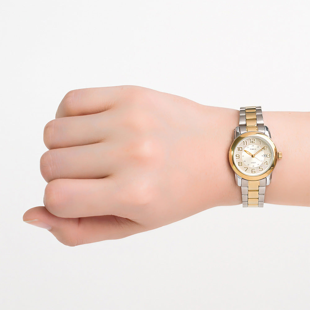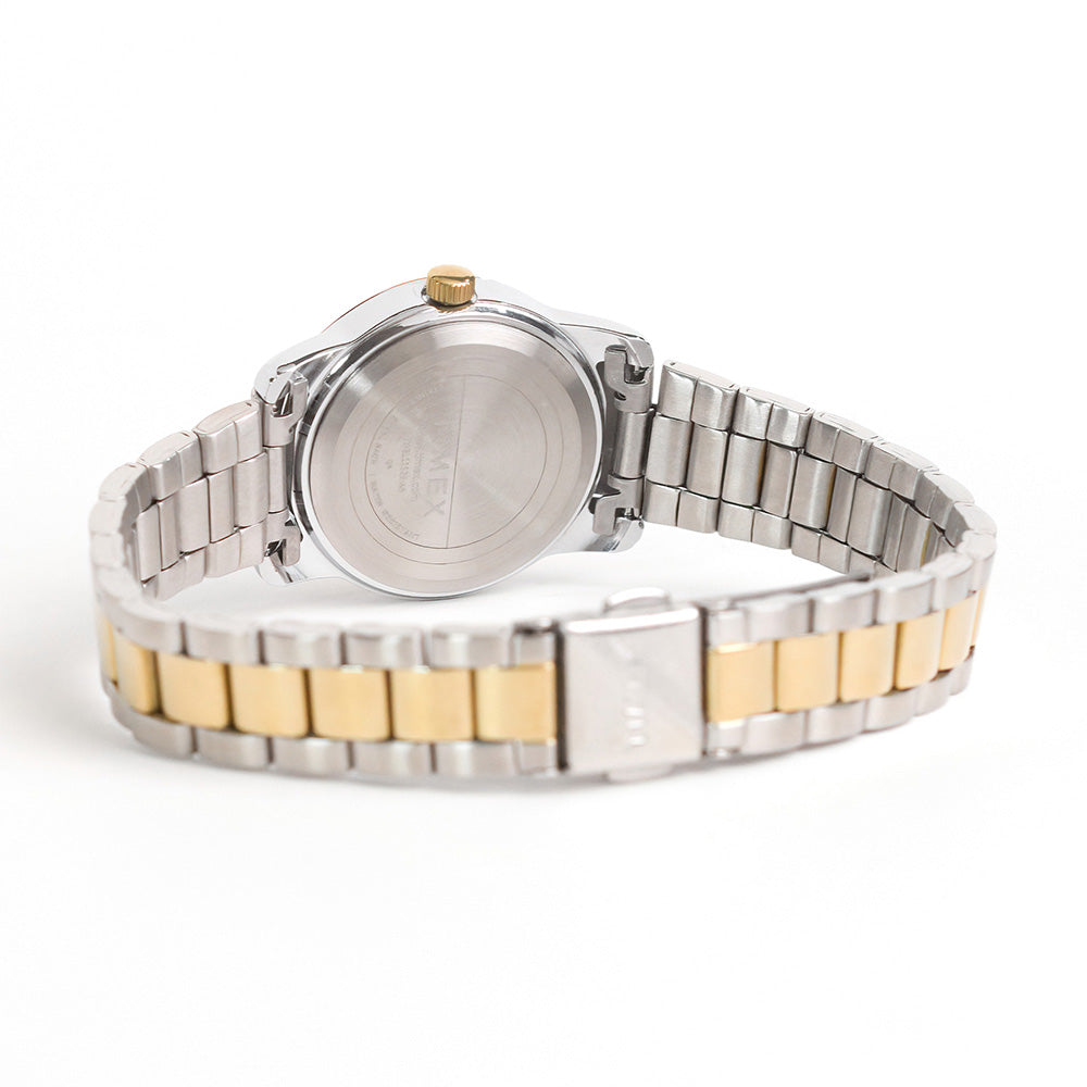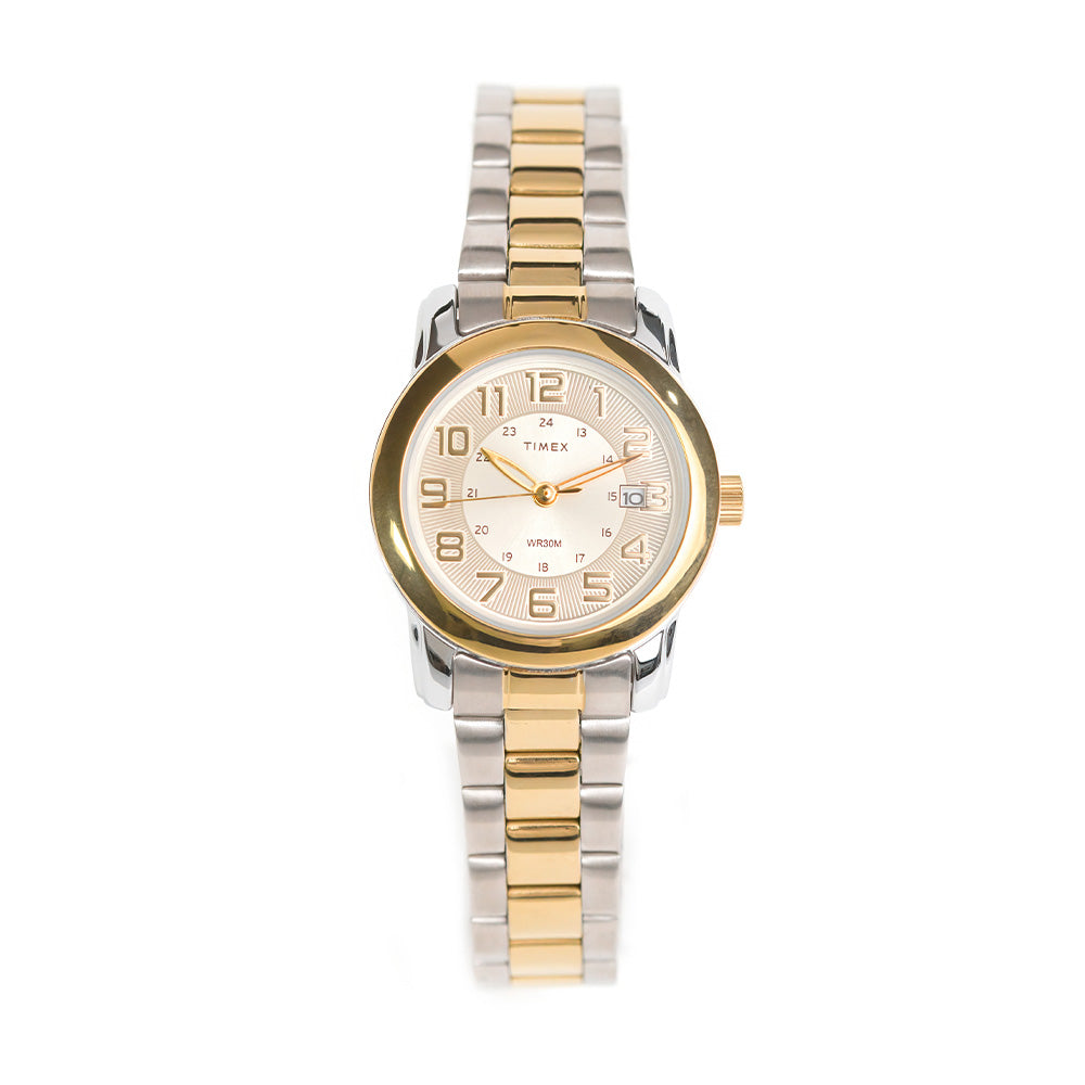 Elegant yet classic Timex watch in stainless steel, set around a high-visibility dial with large gold numeral hour markers and day-date functions.