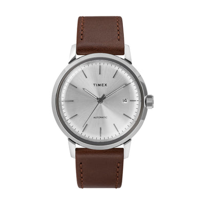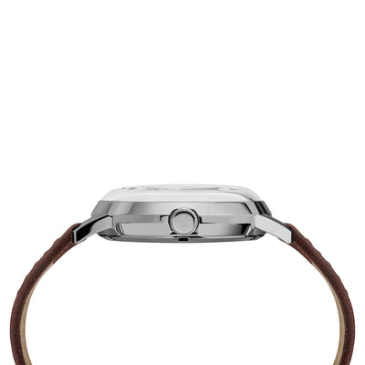 Our iconic 1960s Marlin® case gets an aesthetic refresh. Ticking inside is a tried and true 21 jewel automatic movement, creating a contemporary timepiece that honors our watchmaking history. Powered by your motion as you wear the watch, the movement can store a maximum 40 hours of energy. If motionless longer than 40 hours, wind the watch using the crown until you feel resistance, set it and place the watch back on your wrist where every motion will provide energy for the movement. True to our original Marlin® design, the stainless steel case and silver-tone dial are complemented by a classic brown leather strap, featuring leather from the S.B. Foot Tanning Company, and its iconic domed acrylic crystal. KEEP ON TICKING®