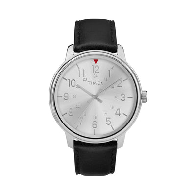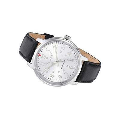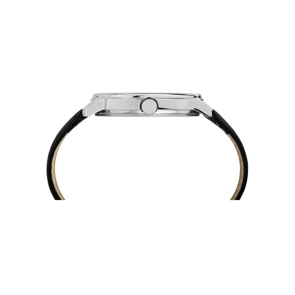Timeless and sophisticated, this watch is great for everyday use and features a silver-tone case, silver dial and black leather strap.