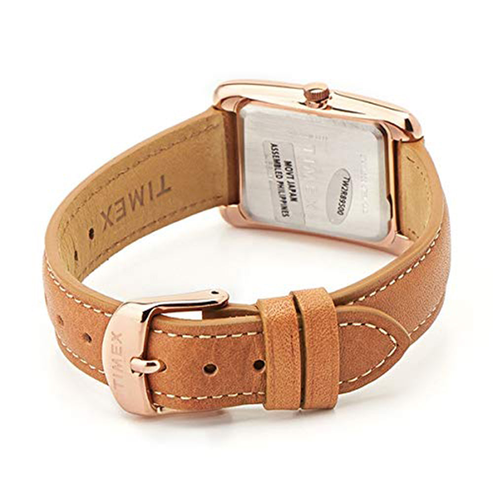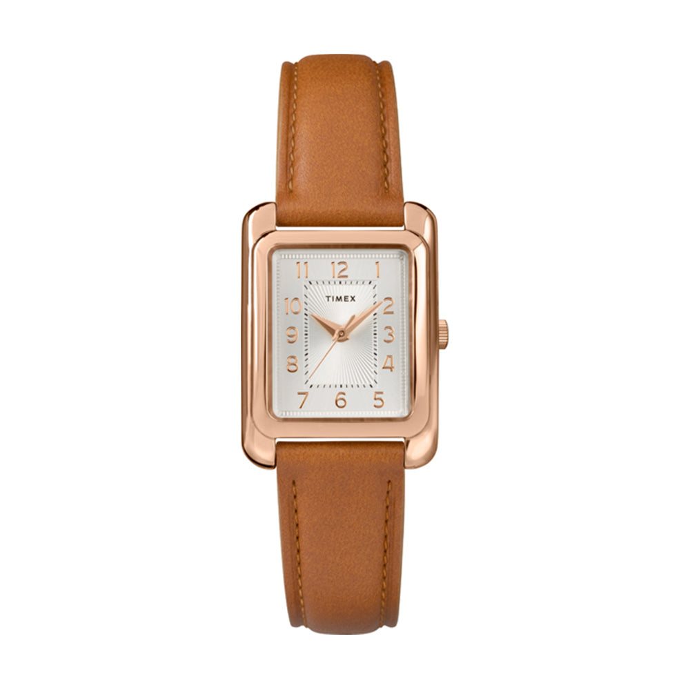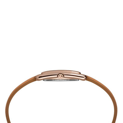 A modern take on a classic design, the Meriden collection is the definition of subtle and understated fashion. Featuring a rectangular rose gold-tone case, silver-tone dial and tan leather strap, the details of this watch come together to create a timeless look.