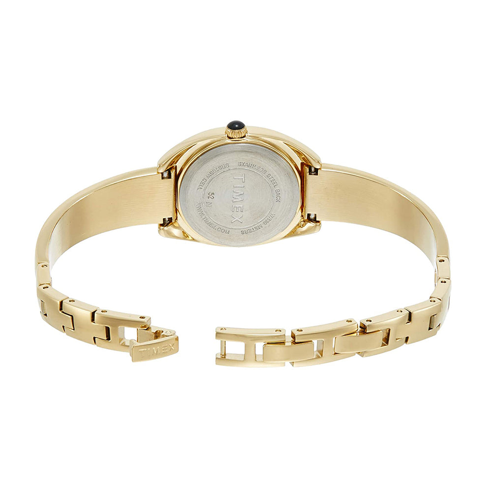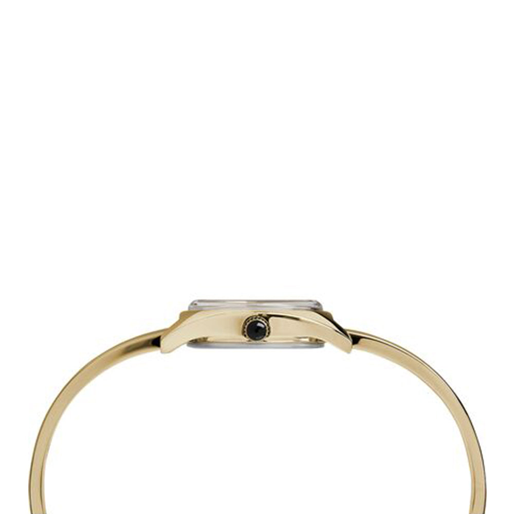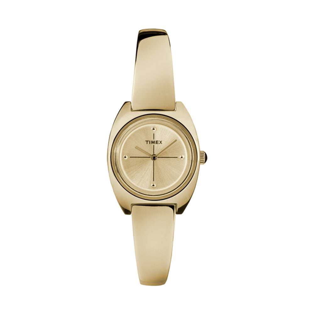 This case is petite, but the design is bold. The polished Gold-tone plated case and hour markers complement the champagne dial and semi-bangle bracelet.