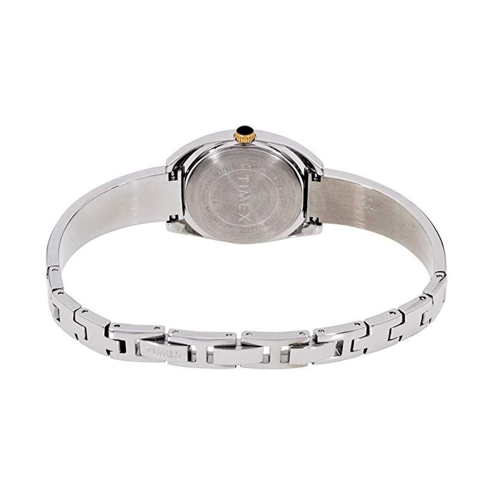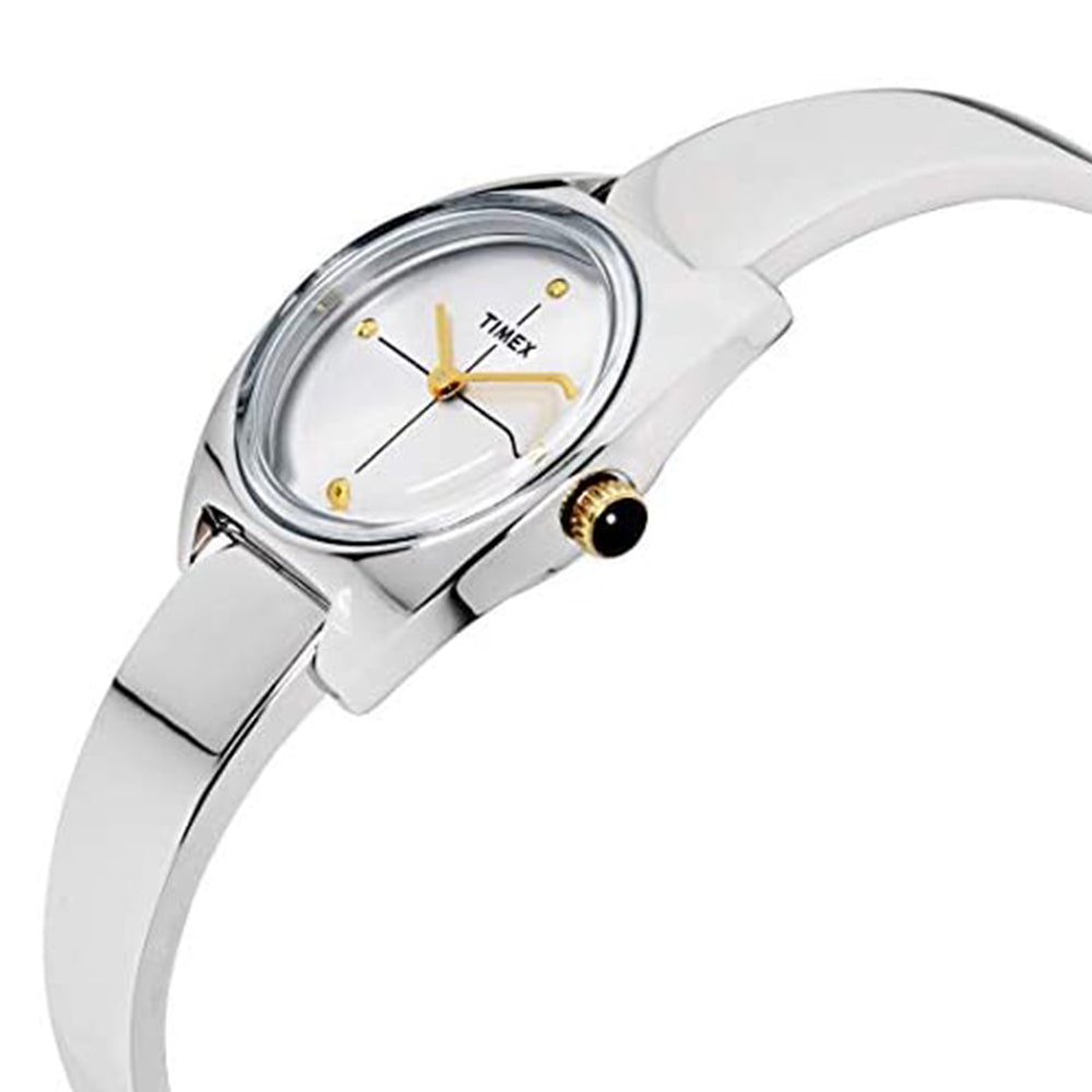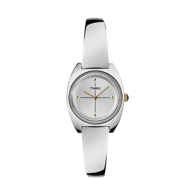 This case is petite, but the design is bold. The polished silver-tone case and hour markers complement the silver-tone dial and semi-bangle bracelet.