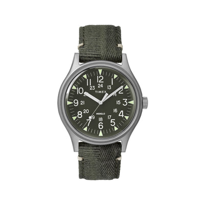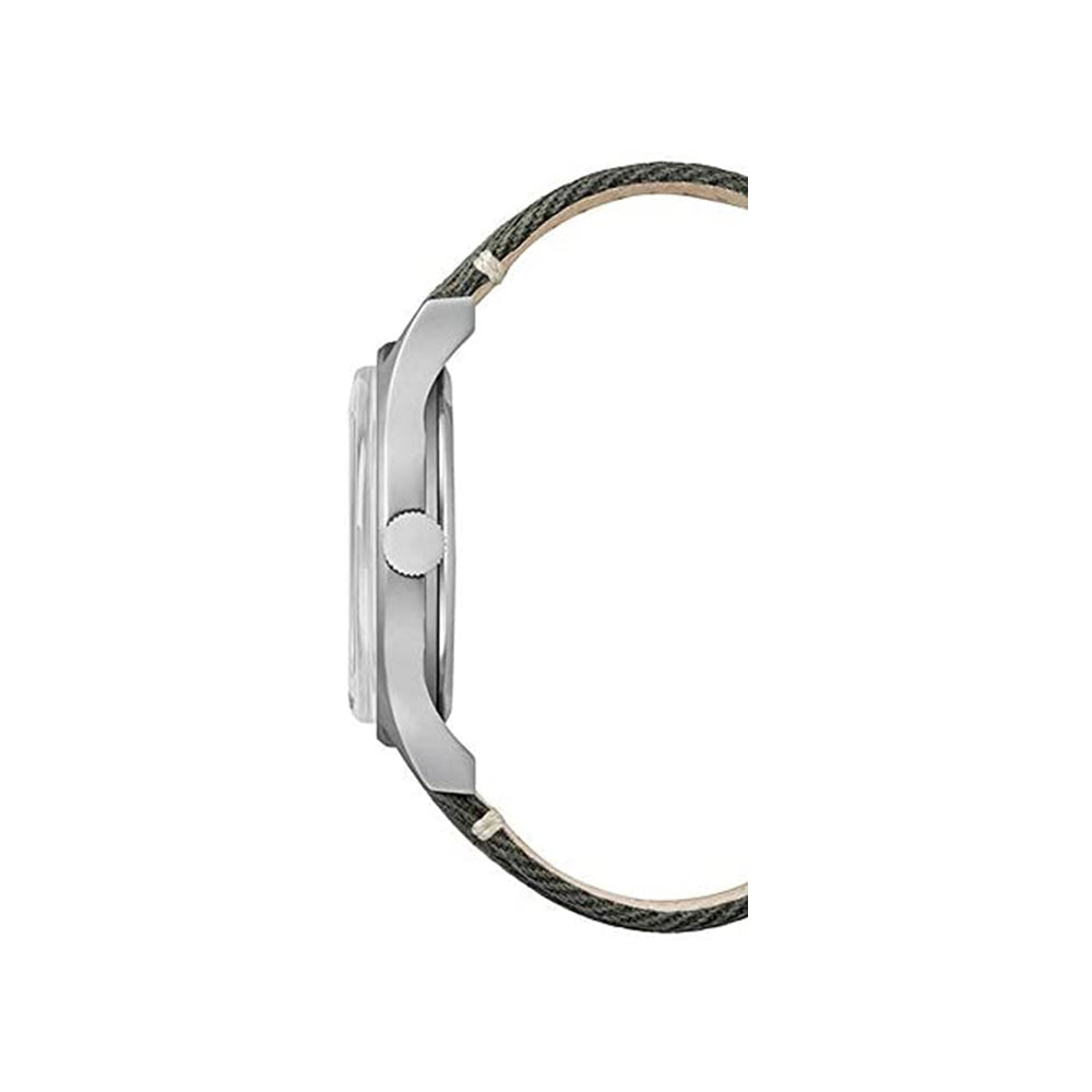 We’ve forged our iconic, military-style watch in aircraft-quality steel with a matte finish. A domed lens and olive green fabric strap complete a look built for everyday maneuvers.