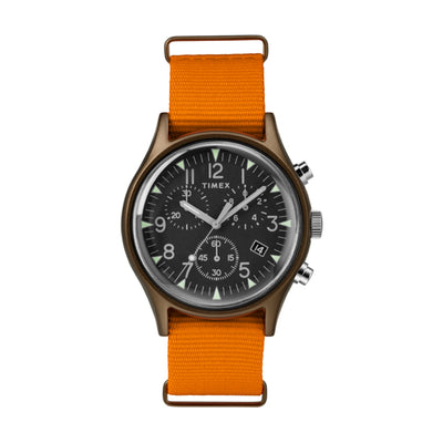 We’ve updated our iconic military watch with new features to create the MK1™ Aluminum Chronograph. The anodized olive aluminum case provides strength without weight, and the orange double-layer fabric slip-thru is our most comfortable strap yet.