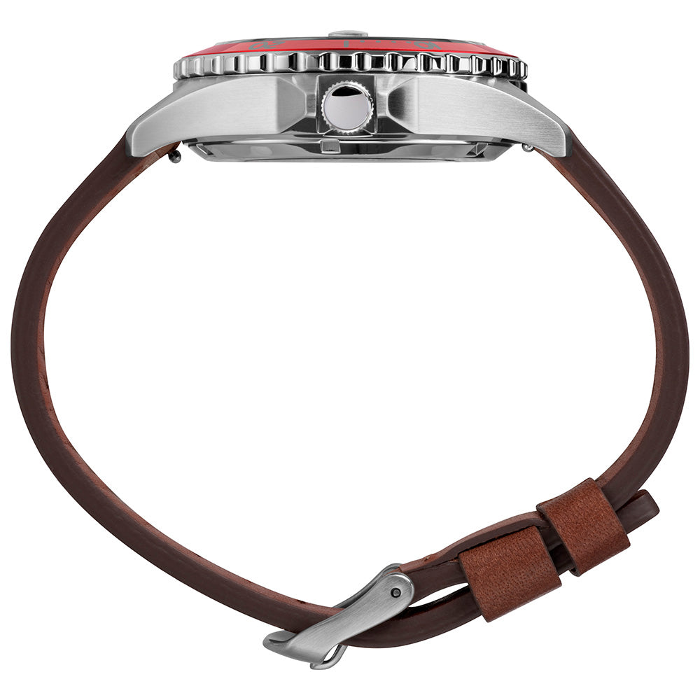 The best inspiration is always found while searching our archives. Our Navi XL Automatic brings together design inspiration from our earliest diver-style watches and pairs it with a 21-jewel automatic movement…so your watch keeps ticking as long as you keep moving. Powered by your motion as you wear the watch, the movement can store a maximum 40 hours of energy. If motionless longer than 40 hours, wind the watch using the crown until you feel resistance, set it and place the watch back on your wrist where every motion will provide energy for the movement. The stainless steel case with a rotating top ring, black dial and brown leather strap provide a modern take on this vintage design.