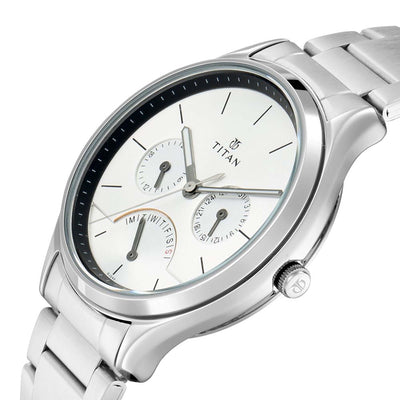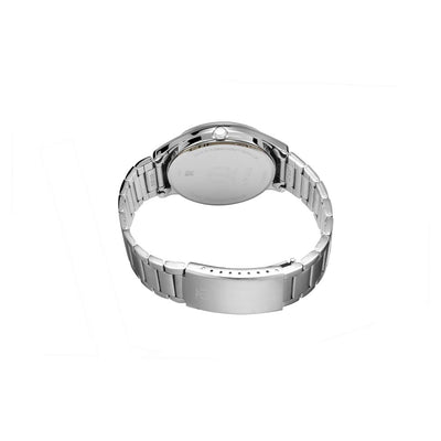 This watch from the workwear collection commemorates workwear stylishly. The rose gold indices, the silver dial, the metal case and a stainless steel strap complete the all steel formal look. The fold-over clasp gives the user a feeling of secured wrist fit. The analog day and date functionality give a very deceptive look but encompasses the most modern workwear trend. Give your wrist the perfect blend of style and comfort.